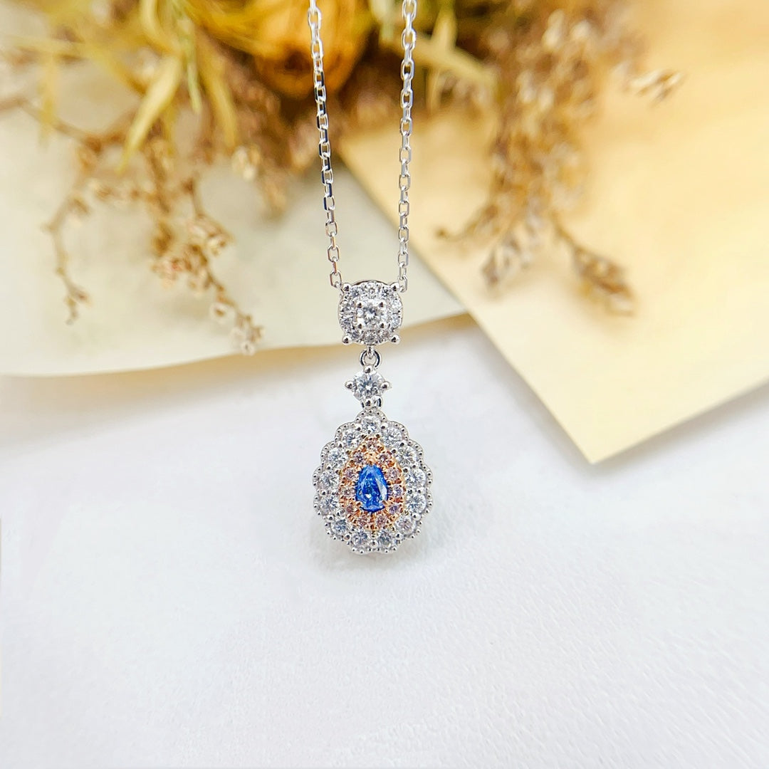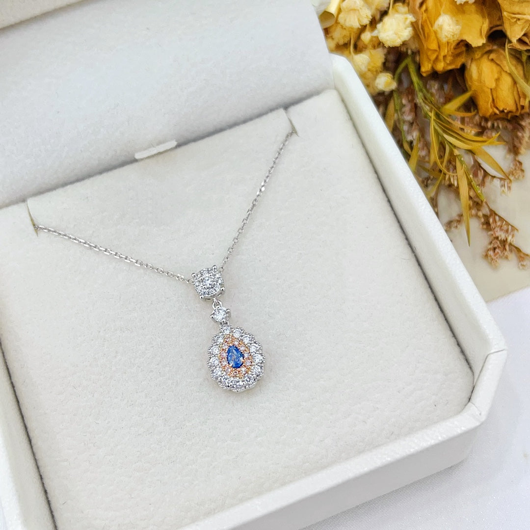 Indulge in the exquisite elegance of our 18K Gold Blue Diamond Waterdrop Sweet Necklace, a true masterpiece of jewelry craftsmanship. This stunning necklace features a central blue diamond weighing D0.07ct, complemented by smaller diamonds totaling d0.35ct, all encased in a luxurious 18K gold setting. With a total weight of 2.51g, this necklace is designed to add a touch of sophistication and glamour to any ensemble. The unique waterdrop design symbolizes grace and femininity, making it a perfect gift for yourself or a loved one. Embrace the luxury and make this exquisite piece of jewelry a part of your collection today. Experience the allure of premium jewelry that speaks to your unique taste and style. Shop now and elevate your every look with this enchanting necklace.