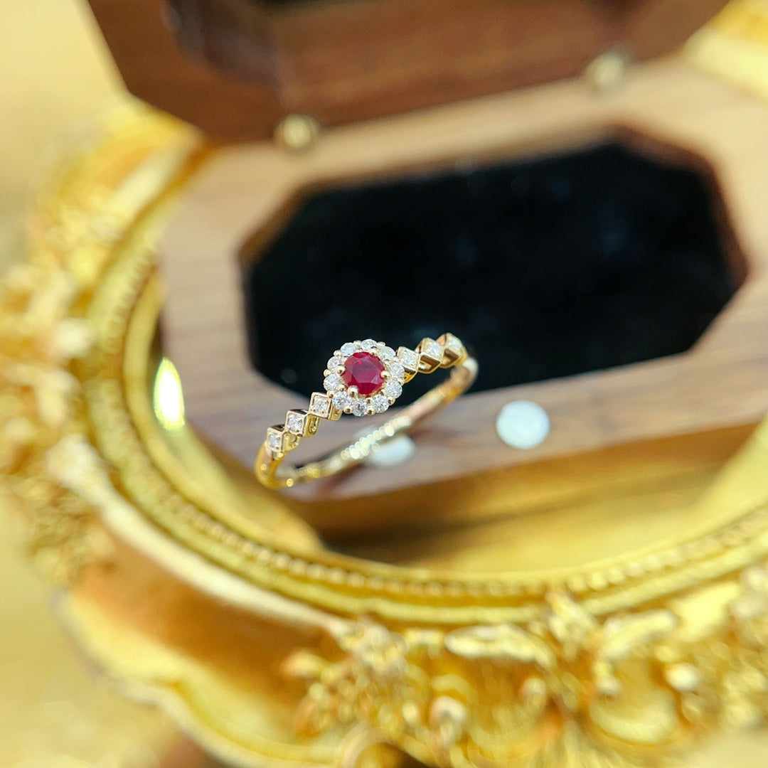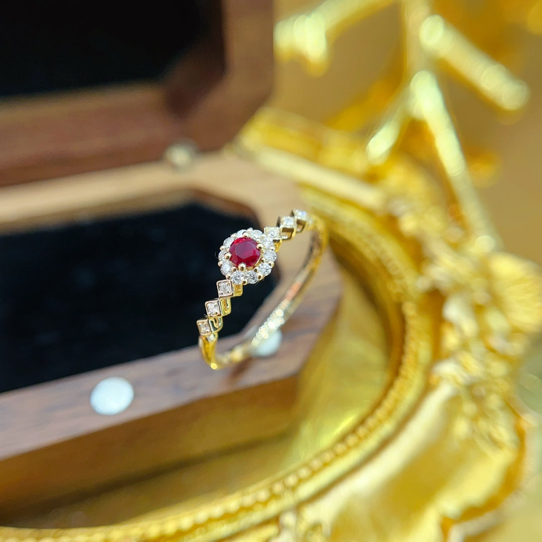 Discover the elegance of our 18K Gold Red Ruby Round Diamond Halo Arm Ring, a true masterpiece in jewelry craftsmanship. This exquisite ring features a central red ruby gemstone weighing R0.12ct, complemented by sparkling diamonds totaling d0.10ct, creating a dazzling display of light and color. Crafted with precision and attention to detail, this ring boasts a total weight of 1.85g and is available in sizes 12, 14, and 16, with resizable options for a perfect fit.