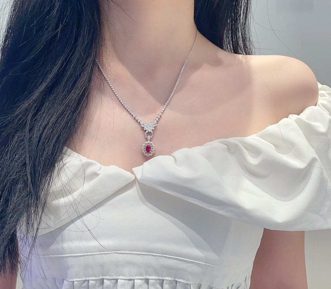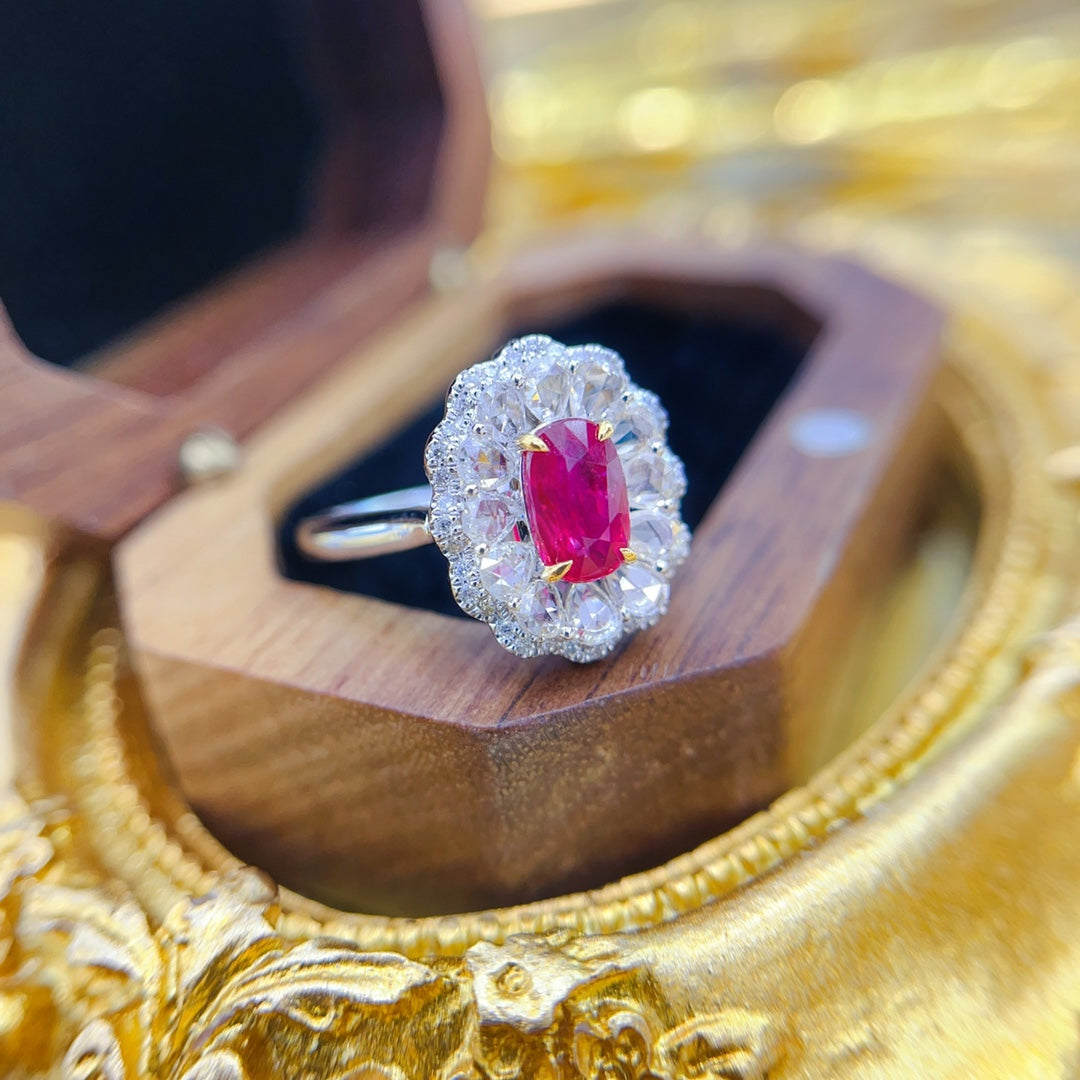 Discover the exquisite elegance of our 18K gold ruby ellipse double-wear jewelry, a masterpiece that combines luxury with versatility. The centerpiece boasts a radiant ruby of 1.05 carats, complemented by an array of diamonds totaling 0.69 carats, creating a mesmerizing display of light and color. Crafted with precision, this 5.08-gram jewelry piece features a size 14 ring setting (adjustable for a personalized fit).