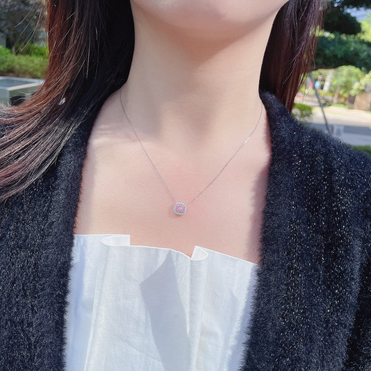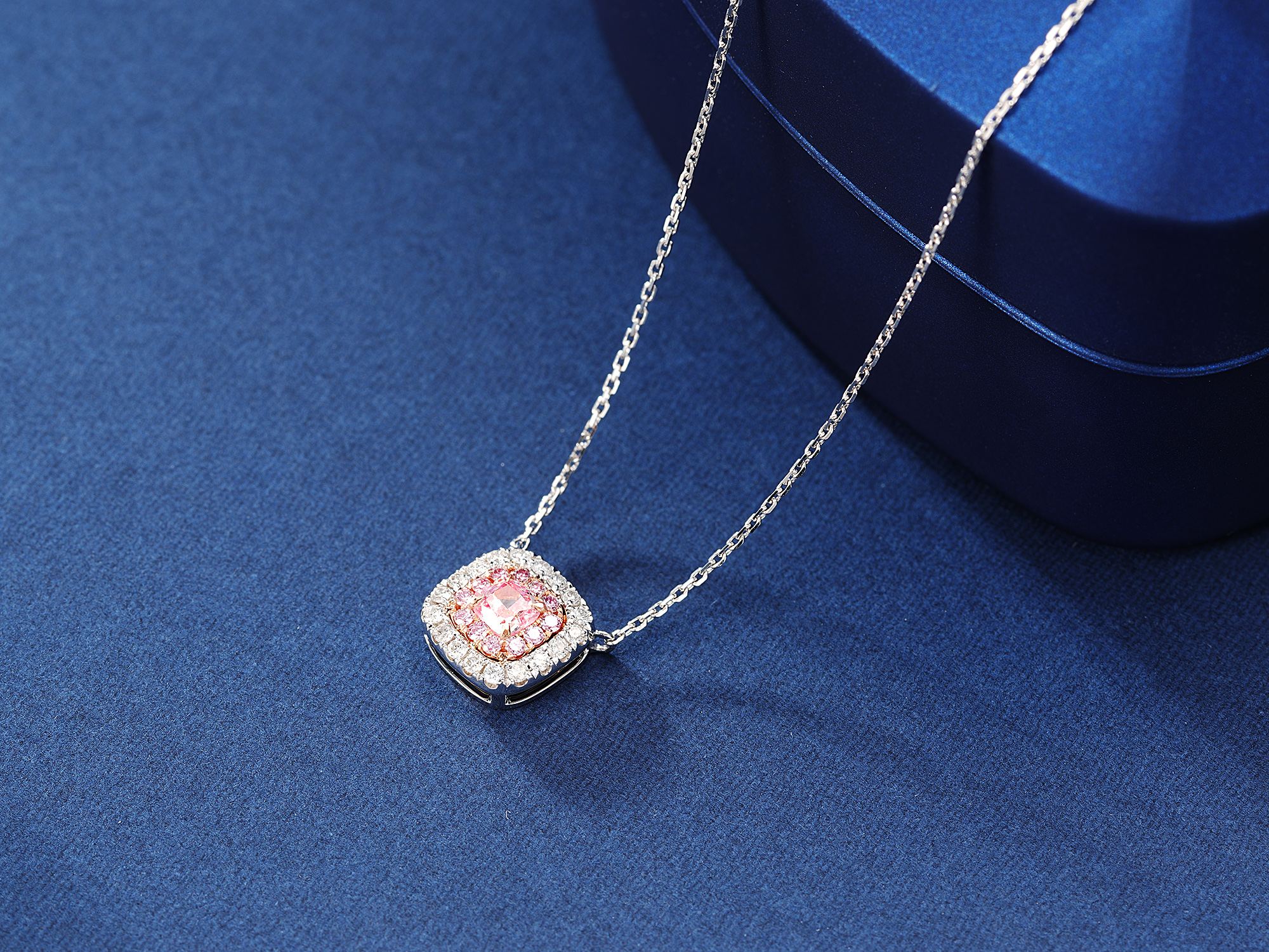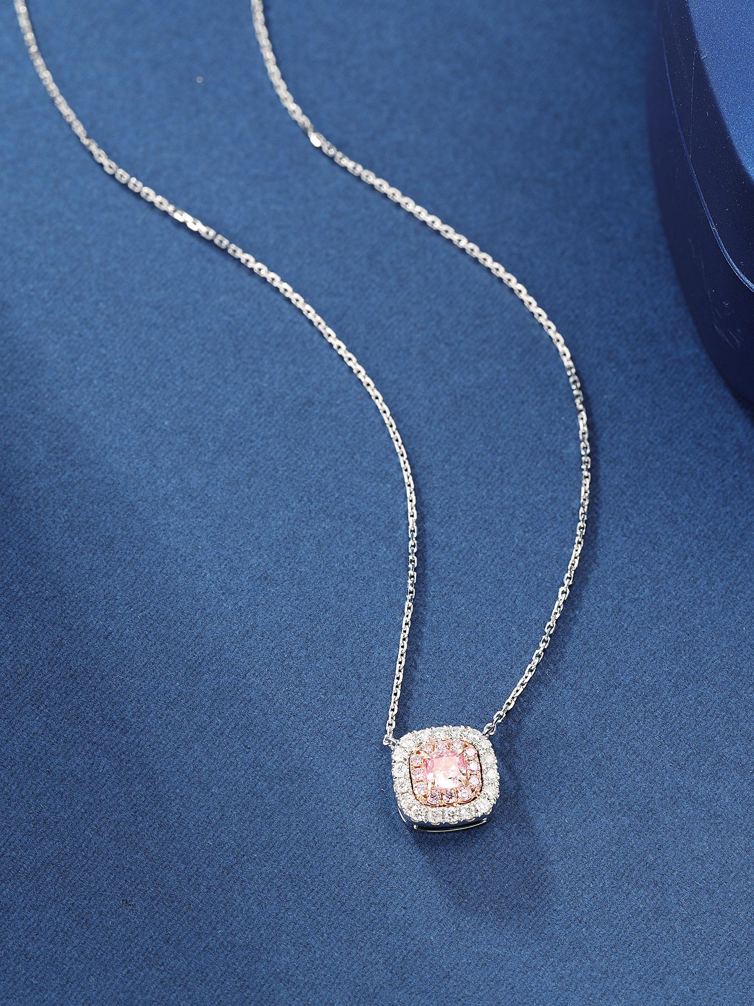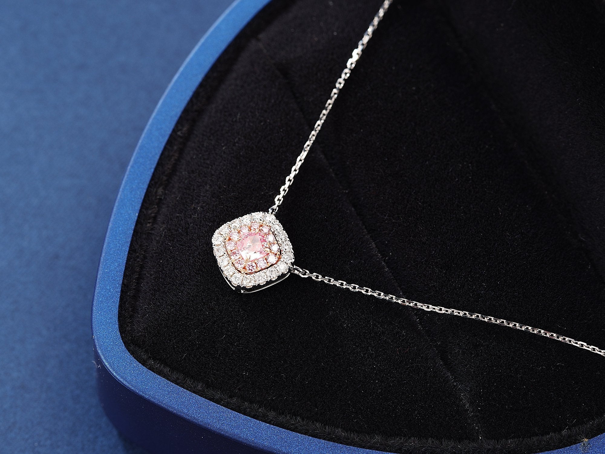 Experience the ultimate luxury with our exquisite 18K Pink Diamond Cushion-Cut Halo Necklace. This stunning piece of jewelry features a central pink diamond weighing 0.17ct, beautifully accentuated by surrounding diamonds totaling 0.19ct. Crafted to perfection, this necklace boasts a total weight of 2.21g, offering a perfect blend of elegance and sophistication. Elevate your jewelry collection with this remarkable piece that encapsulates timeless beauty and exceptional craftsmanship. Don’t miss the opportunity to own this exquisite necklace that promises to add a touch of glamour to any attire. Explore our collection now and indulge in the allure of fine jewelry.