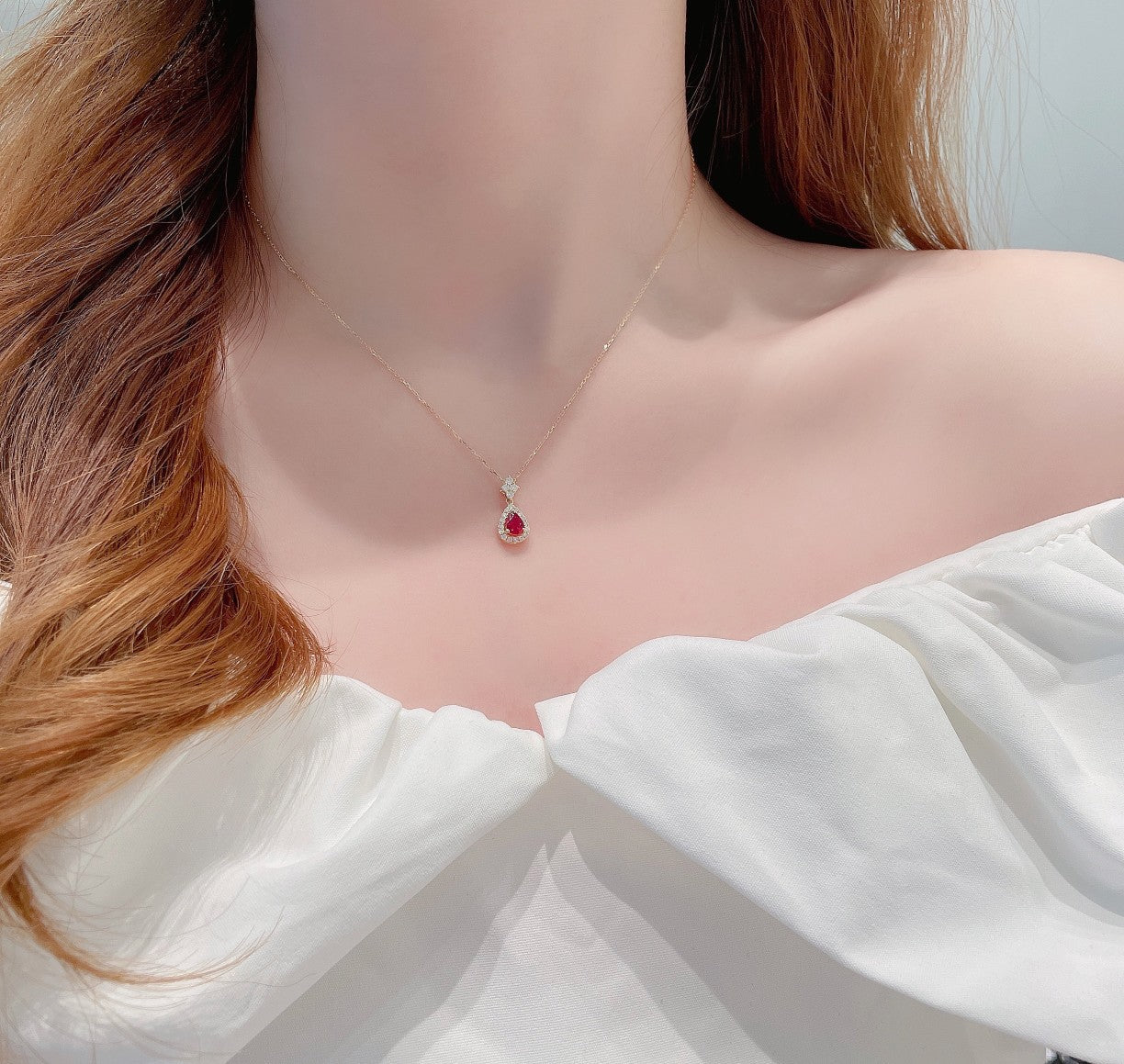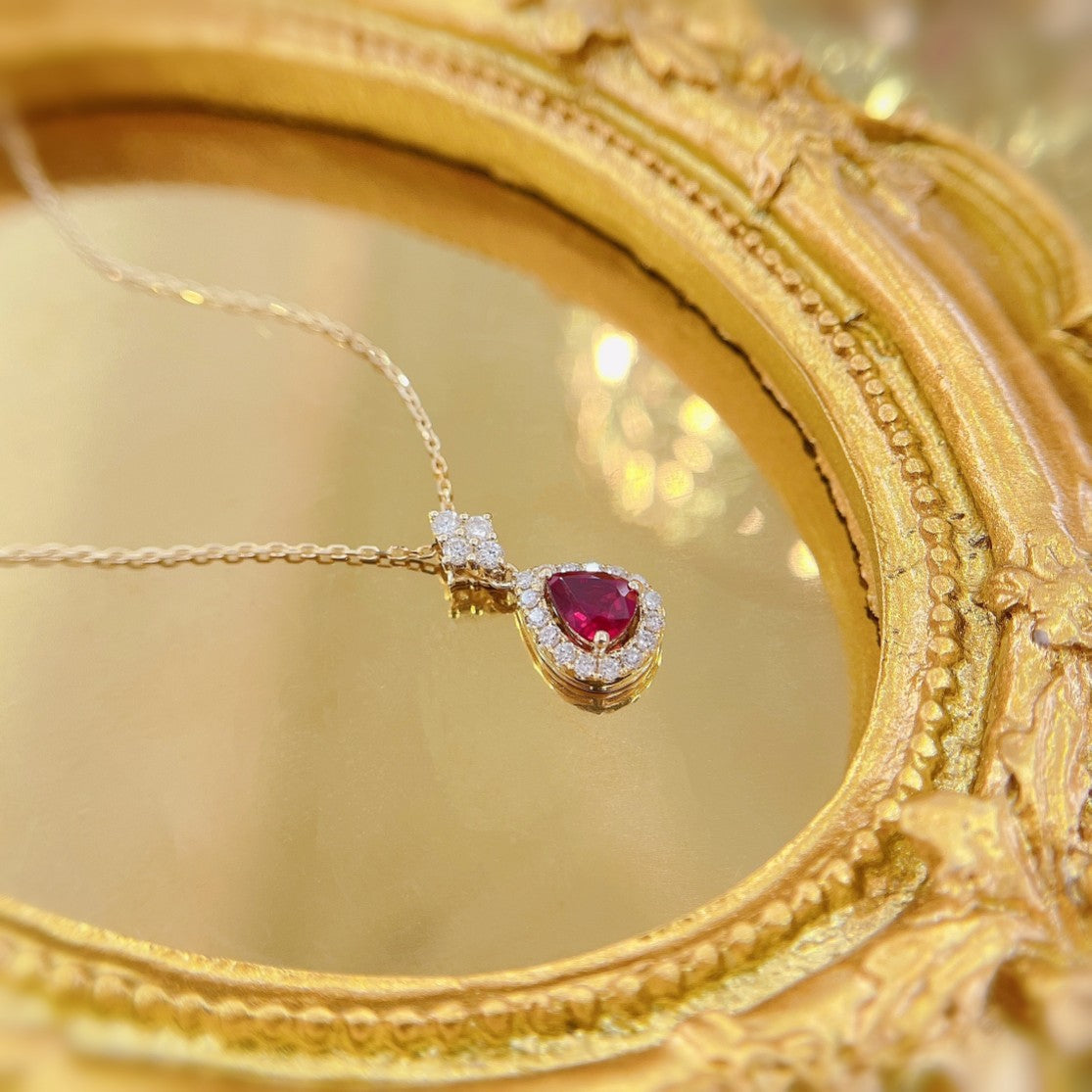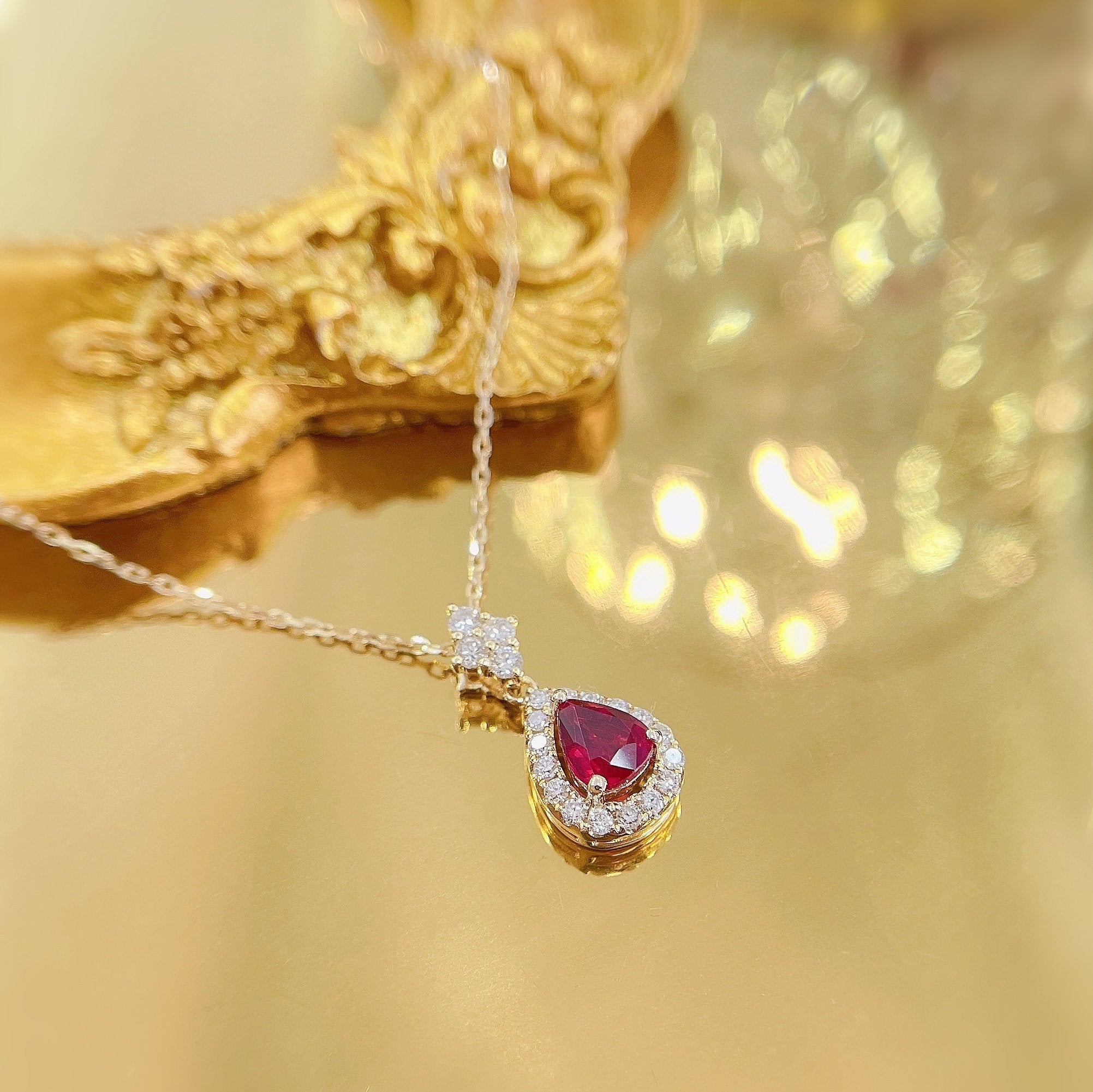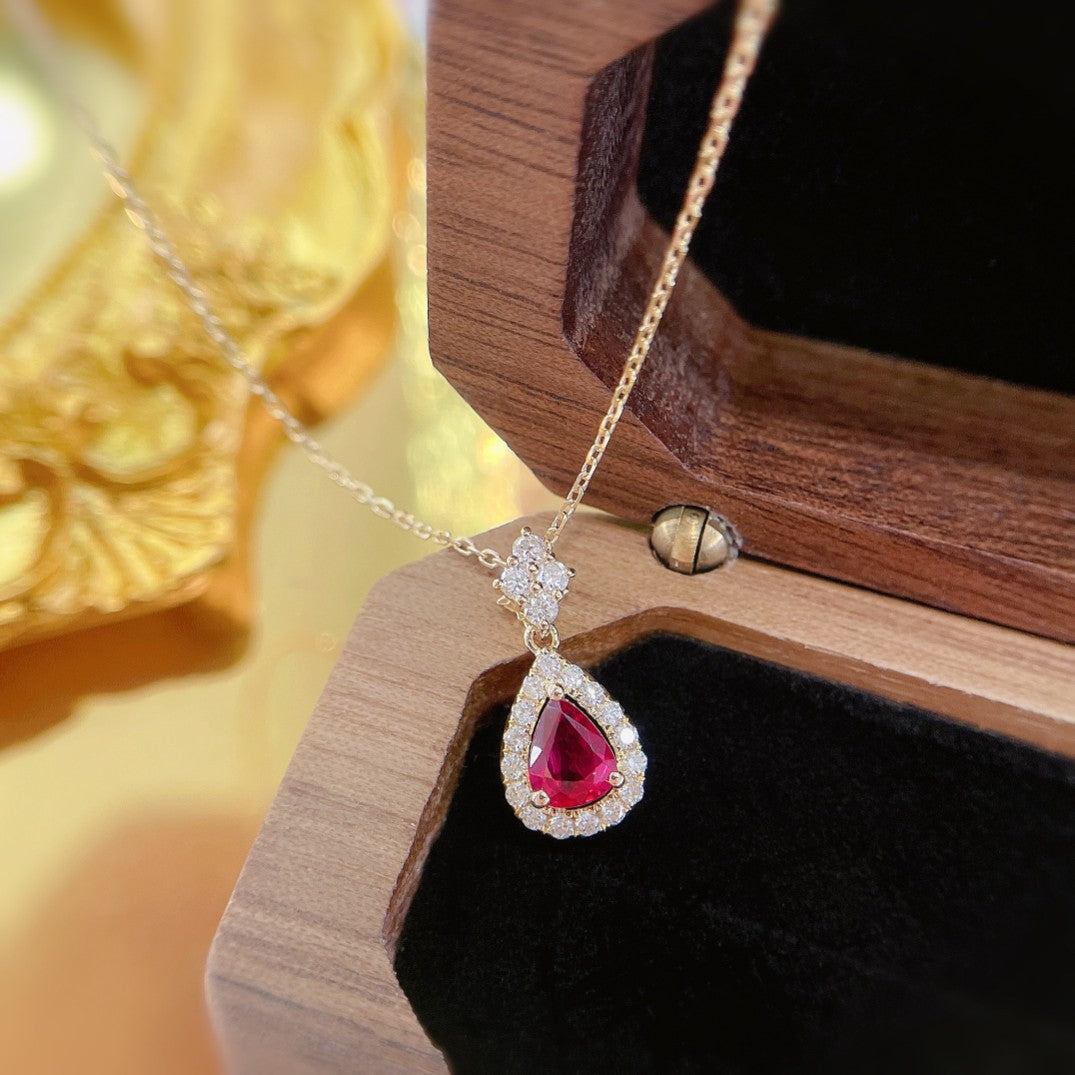 Indulge in the luxury of our exquisite 18K Red Gemstone Waterdrop Pendant with Diamond Halo Necklace. This stunning piece of jewelry boasts a vibrant red gemstone as its centerpiece, weighing 0.41 carats, surrounded by a dazzling array of diamonds totaling 0.18 carats. Crafted with precision and attention to detail, this necklace weighs 1.74 grams and is designed to make a statement. The perfect accessory to elevate any ensemble, it adds a touch of sophistication and glamour to your look. Make this remarkable jewelry piece a part of your collection and experience the elegance it brings. Don’t miss the opportunity to own this captivating necklace that combines beauty, craftsmanship, and timeless appeal. Order now and embrace the allure of fine jewelry.