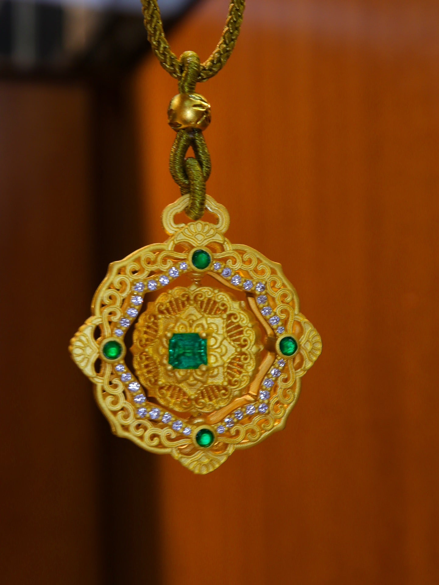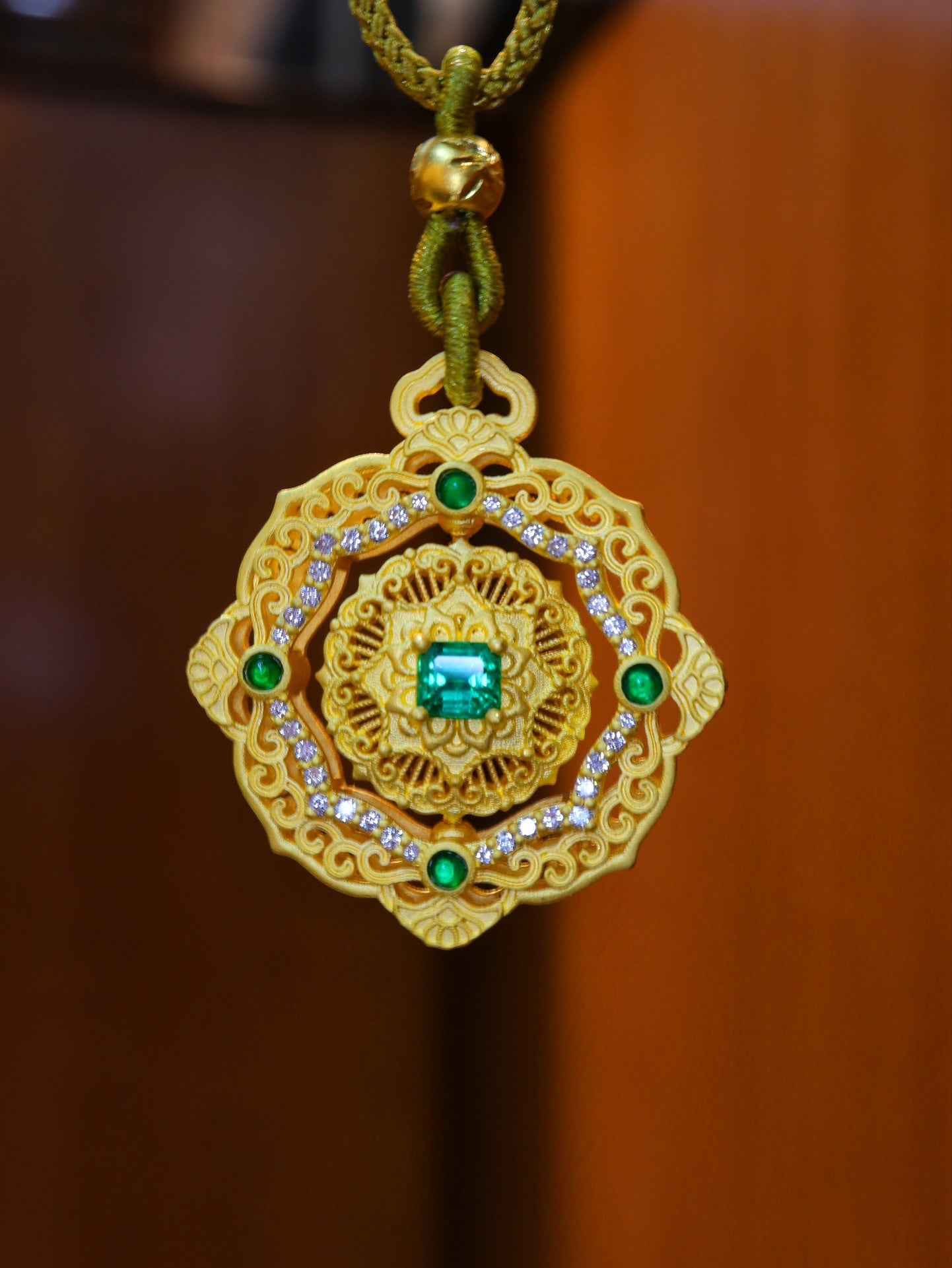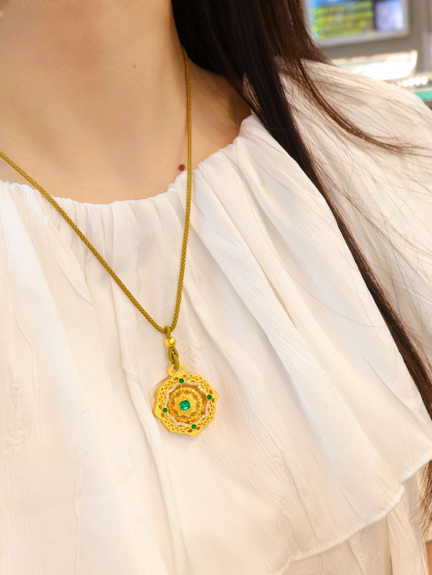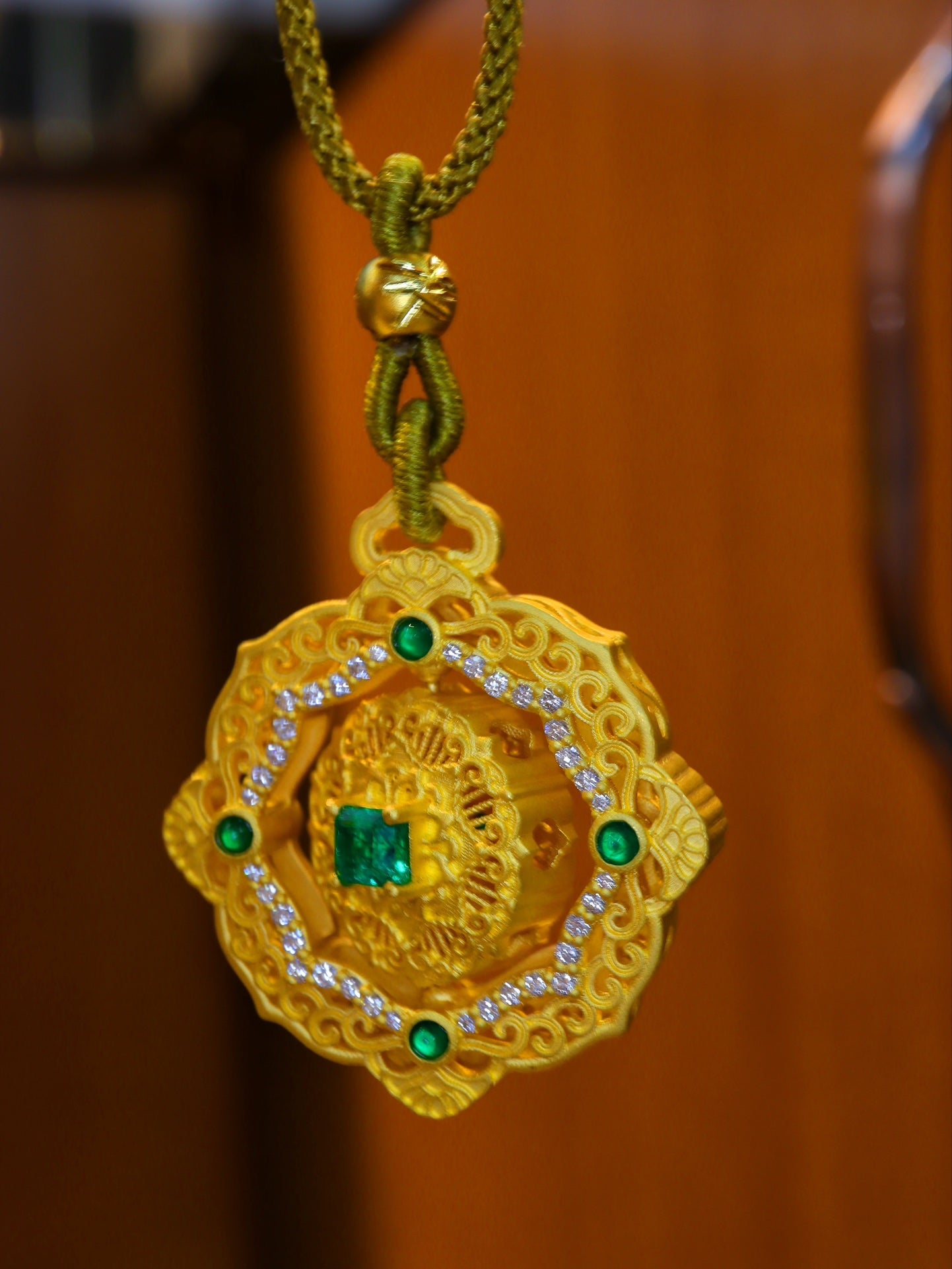 Indulge in the luxury of our 24k Gold Grandmother Green Pendant, crafted with high-quality Panjshir emerald. This exquisite piece features intricate double-sided carvings, symbolizing good fortune and blessings. With a primary gemstone weighing 0.78ct, complemented by diamonds totaling 0.41ct, and solid gold weighing 21.32g, this pendant is a true masterpiece. Elevate your jewelry collection with this stunning piece that embodies elegance and sophistication. Don’t miss the opportunity to own this remarkable jewelry that combines beauty, craftsmanship, and auspicious meanings. Act now to adorn yourself with this magnificent treasure.