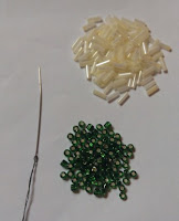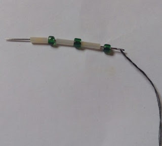 3. 拿起 1 个种子珠 + 1 个军号珠 + 1 个种子珠 + 1 个军号珠 + 1 个种子珠 + 1 个军号珠(总共 6 个珠子)并将它们滑到线上。