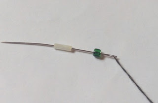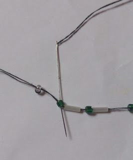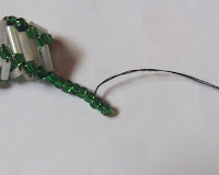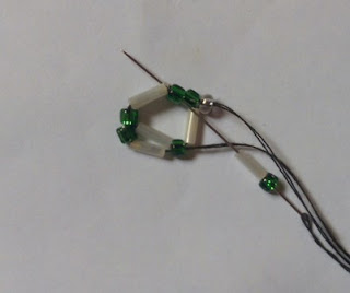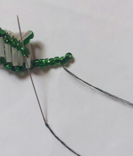 5. 取一个种子珠 + 1 个军号珠,将针穿过下一个种子珠(第 3 步中选择的第二个种子珠)。