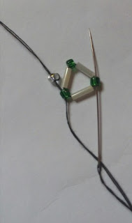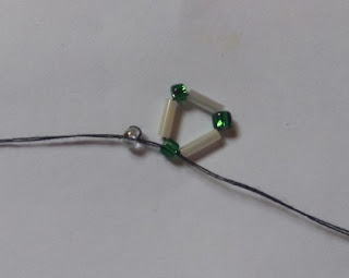 4. 将针从下到上穿过第一个添加的种子珠。 拉动你的线以获得三角形。