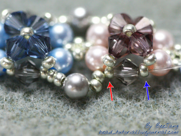 添加两颗种子珠、一颗珍珠和两颗种子珠。 在下一个系列中将线传递到种子珠(红色箭头)。 将电线传递到下一个晶体和籽珠(蓝色箭头)。 对另一根电线做同样的事情。