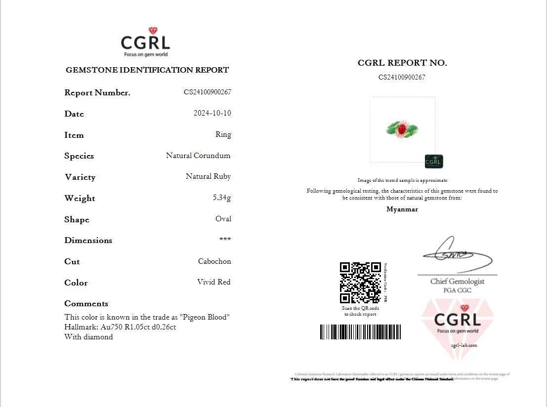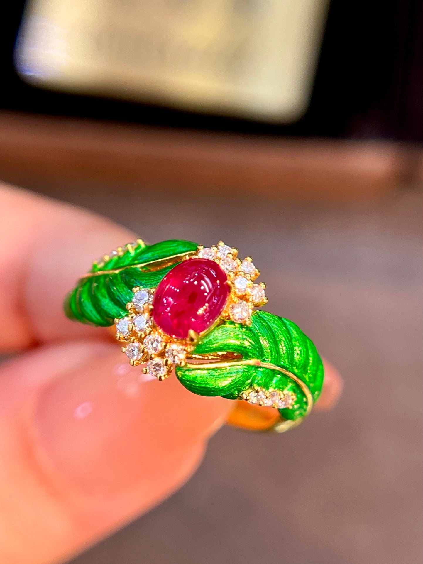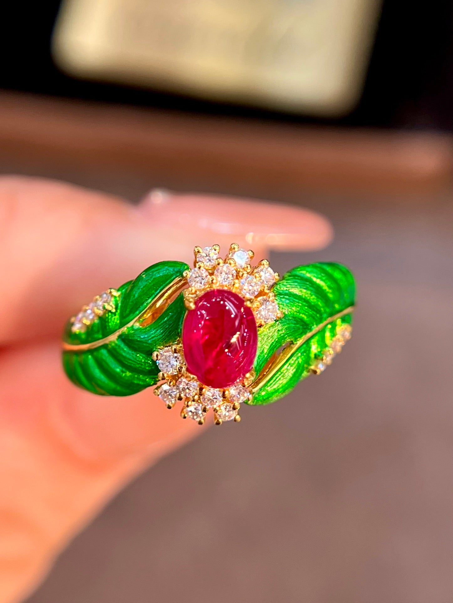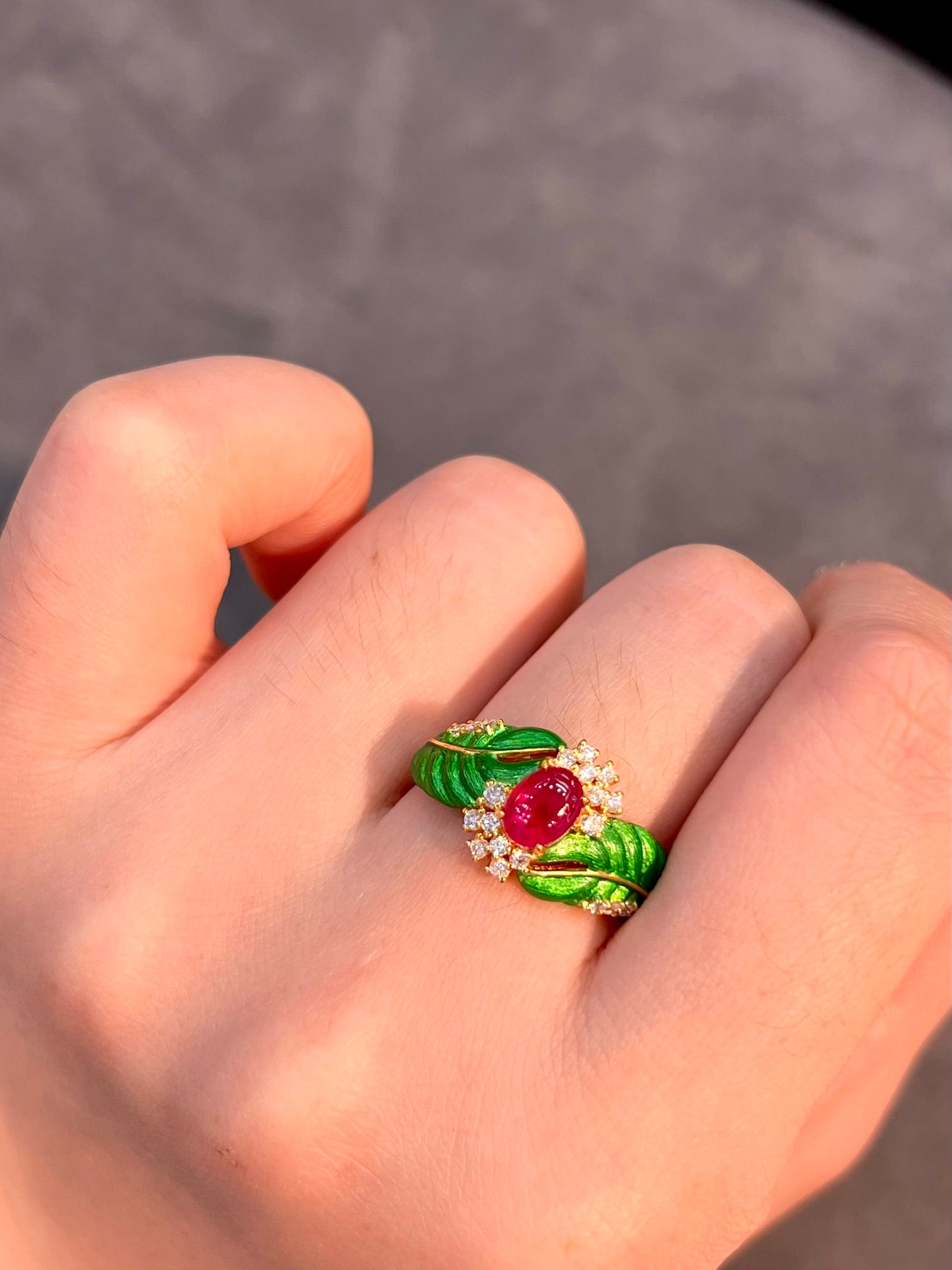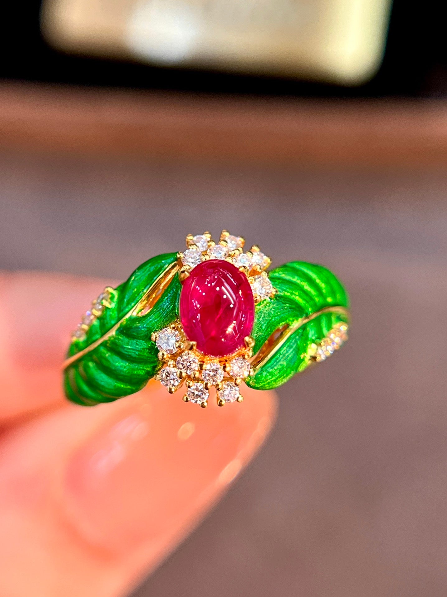 Embrace elegance with this stunning 18k gold ring, featuring a vibrant Myanmar pigeon’s blood red ruby. The intricate leaf design on the shank beautifully complements the radiant ruby, creating a piece that exudes sophistication and charm. Adorned with 0.26 carats of diamonds, this ring boasts a 1.05-carat ruby, measuring approximately 6.5*49mm, set in 5.12 grams of 18k gold. With an overall width of 11.7mm, this unique jewelry piece is a testament to exquisite craftsmanship and timeless beauty. Don’t miss the opportunity to add this exceptional ruby ring to your collection. Indulge in the luxury of fine jewelry that captures the essence of nature’s beauty. Shop now and elevate your style with this one-of-a-kind piece.