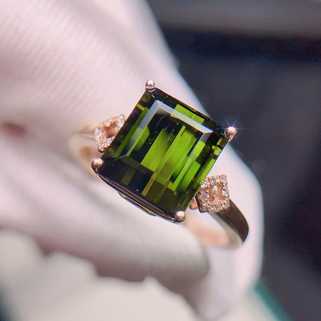 Adorn yourself with this exquisite 18K gold green tourmaline ring, accentuated with genuine South African diamonds. Weighing a total of 2.75g, this ring features a stunning 3.25-carat tourmaline stone and 0.048 carats of diamonds in 16 pave settings. Tourmaline, known as the stone of wealth, is believed to enhance career growth and bring good fortune. This ring not only symbolizes prosperity but also makes a fashionable statement.