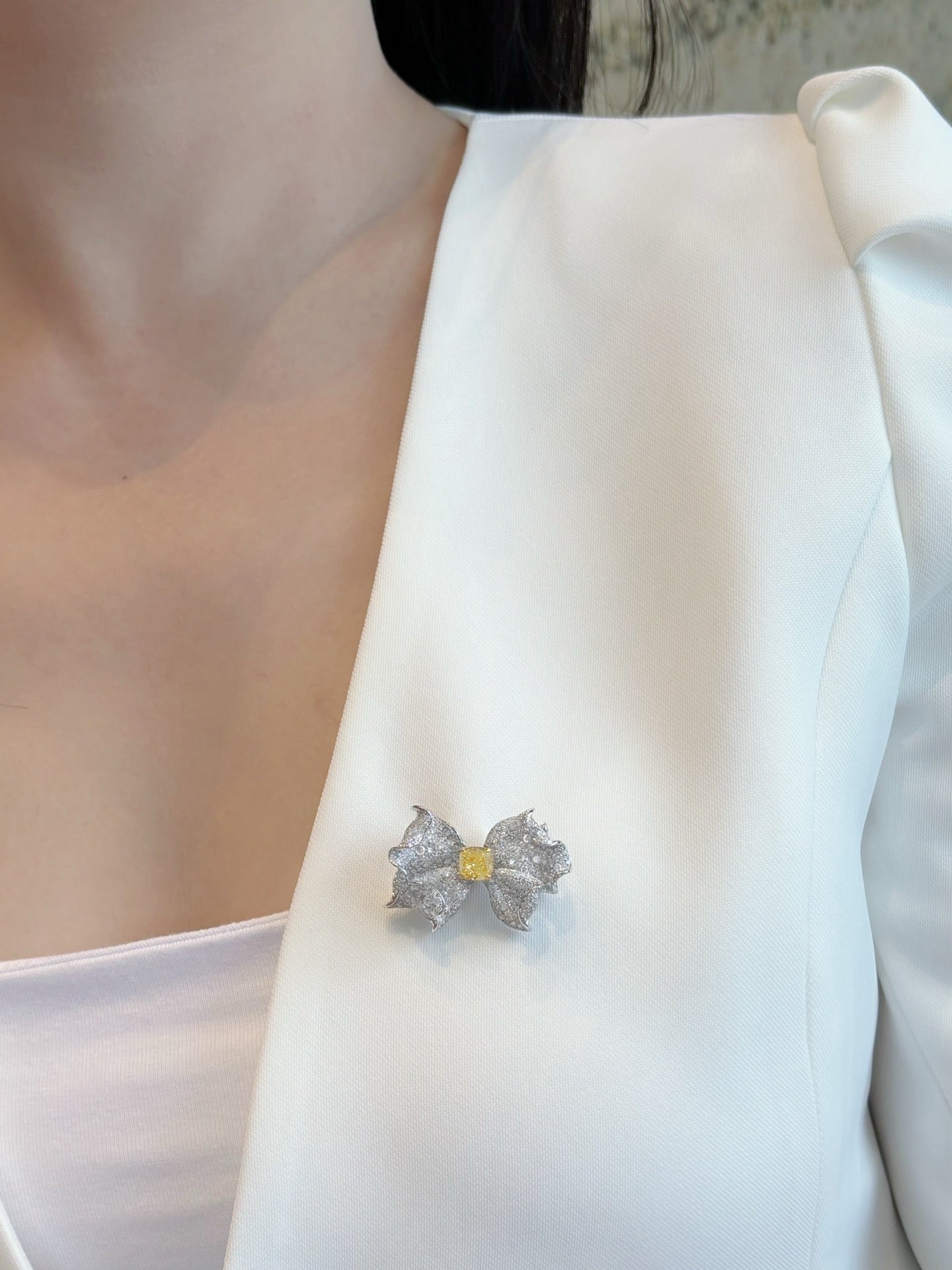 Indulge in the luxury of this exquisite 18K gold jewelry piece adorned with a dazzling array of white and yellow diamonds. The centerpiece boasts a magnificent 2.01ct diamond, complemented by an elegant ensemble of side diamonds totaling 3.97ct. Crafted with precision and weighing 17.1g, this bowknot-inspired design offers a versatile three-way wear option, adapting to your every style and occasion. Its size 14# (adjustable) ensures a comfortable fit for all. Accompanied by the esteemed GIA international certificate, this jewelry piece not only represents a symbol of elegance but also guarantees authenticity and value. Experience the allure of this remarkable creation and make it a cherished addition to your collection. Embrace the elegance, seize the sophistication – acquire this masterpiece today!