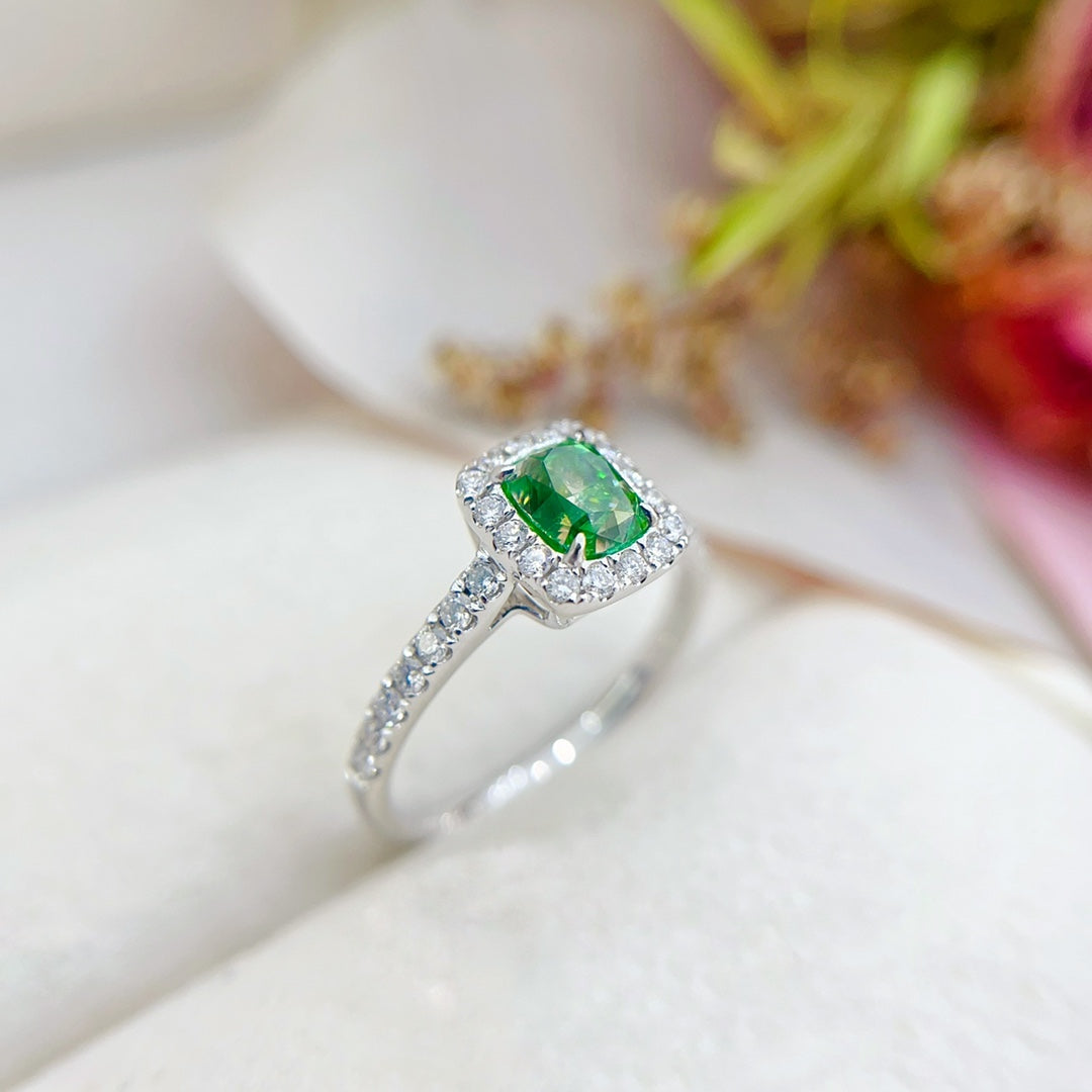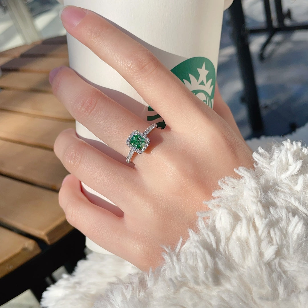 Indulge in the luxury of this exquisite 18K gold ring featuring a stunning green diamond in a cushion-cut design. The main stone boasts a weight of 1.00 carat, complemented by accent stones totaling 0.32 carats. Crafted with precision, this ring weighs 2.97 grams and is sized at 15#, offering a perfect fit for those seeking elegance and sophistication. Accompanied by the esteemed AGL international certificate, this piece of jewelry not only guarantees authenticity but also signifies its exceptional quality. Elevate your jewelry collection with this rare and captivating green diamond ring, a true symbol of refined taste and timeless beauty. Shop now to make this exquisite jewelry yours.