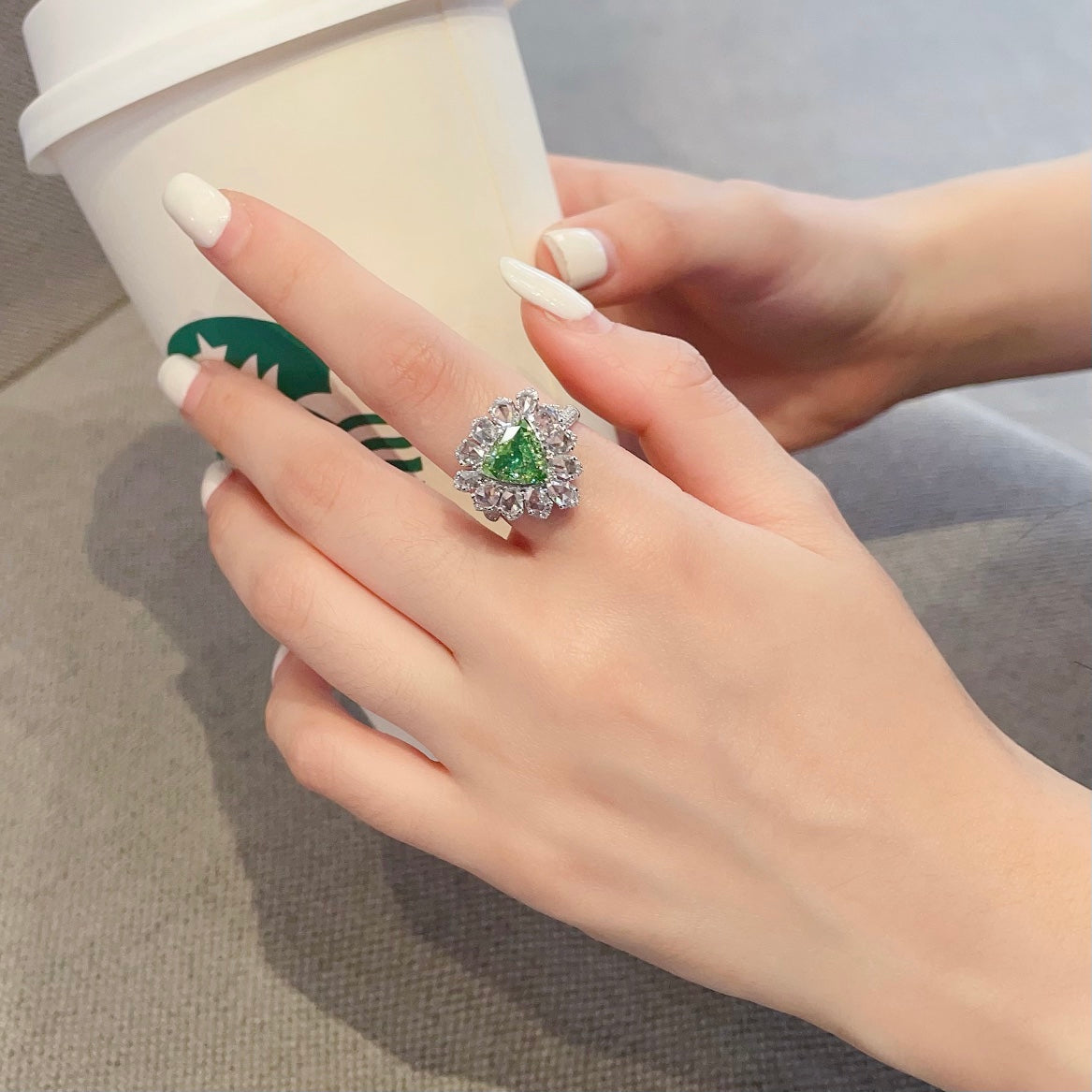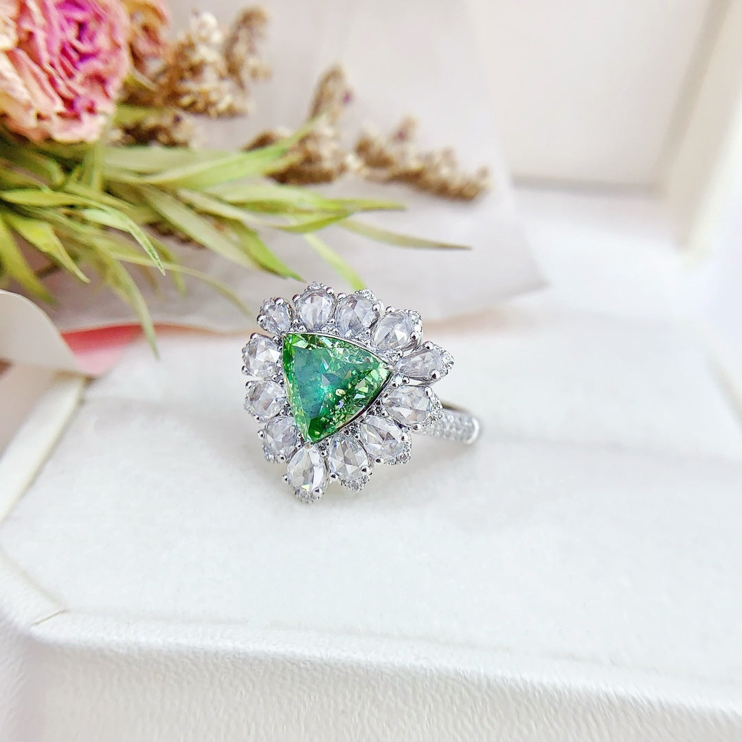 Discover the exquisite elegance of our 18K green diamond triangle rose cut drop two-way wear jewelry. This stunning piece features a main stone weighing 2.02 carats and an accent stone at 1.27 carats, crafted to perfection with a total weight of 6.69 grams. The ring size is 13# (adjustable for your comfort). Accompanied by the esteemed AGL international certificate, this jewelry piece is a testament to luxury and sophistication. Embrace the opportunity to own a piece that radiates timeless beauty and makes a statement wherever you go. Elevate your jewelry collection with this remarkable piece that encapsulates elegance and grace. Shop now and indulge in the luxury you deserve.