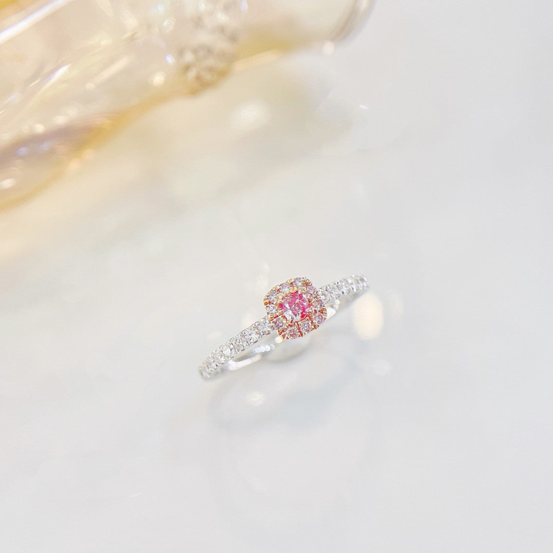 Indulge in the exquisite elegance of our 18K Pink Diamond Cushion Cut Ring, a true masterpiece of jewelry craftsmanship. This ring features a stunning main stone of D0.09ct, complemented by accent stones totaling 0.166ct, all set in a luxurious 18K gold band. With a total weight of 1.56g, this ring is designed to perfection, offering both comfort and style. The ring size is adjustable from 11 to 13#, ensuring a perfect fit for everyone.