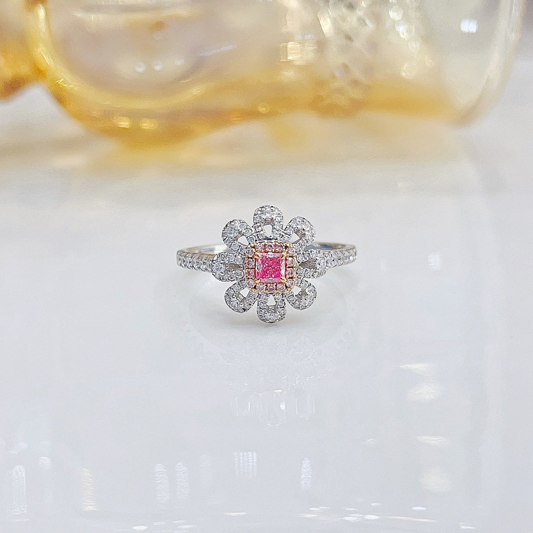Introducing our exquisite 18K Pink Diamond Cushion Flower Ring, a true masterpiece of jewelry craftsmanship. This ring features a dazzling main stone of 0.137ct complemented by accent stones totaling 0.346ct, all set in a luxurious 18K gold band. With a total weight of 2.5g and a size 12# (adjustable for a perfect fit), this ring is designed to make a statement.
