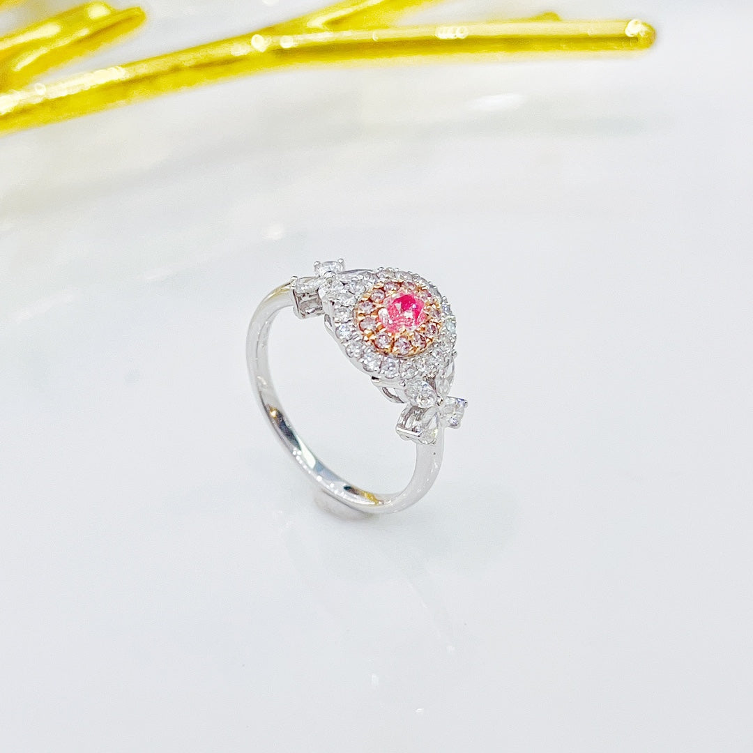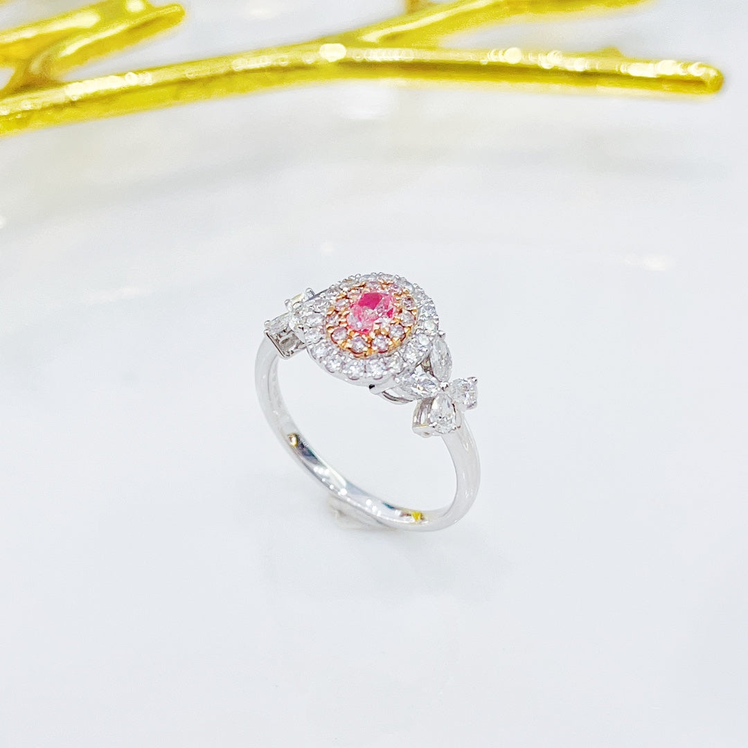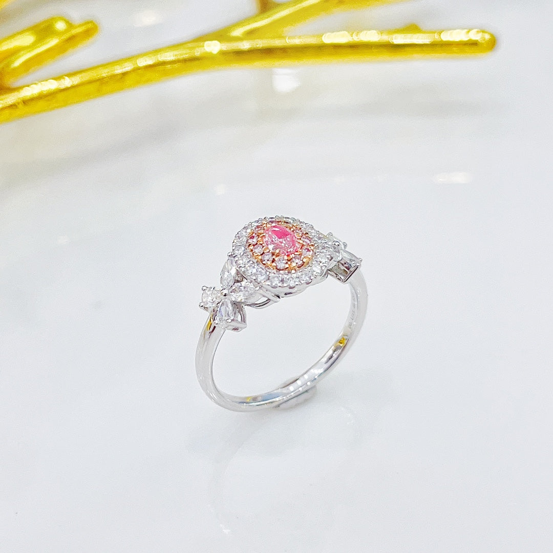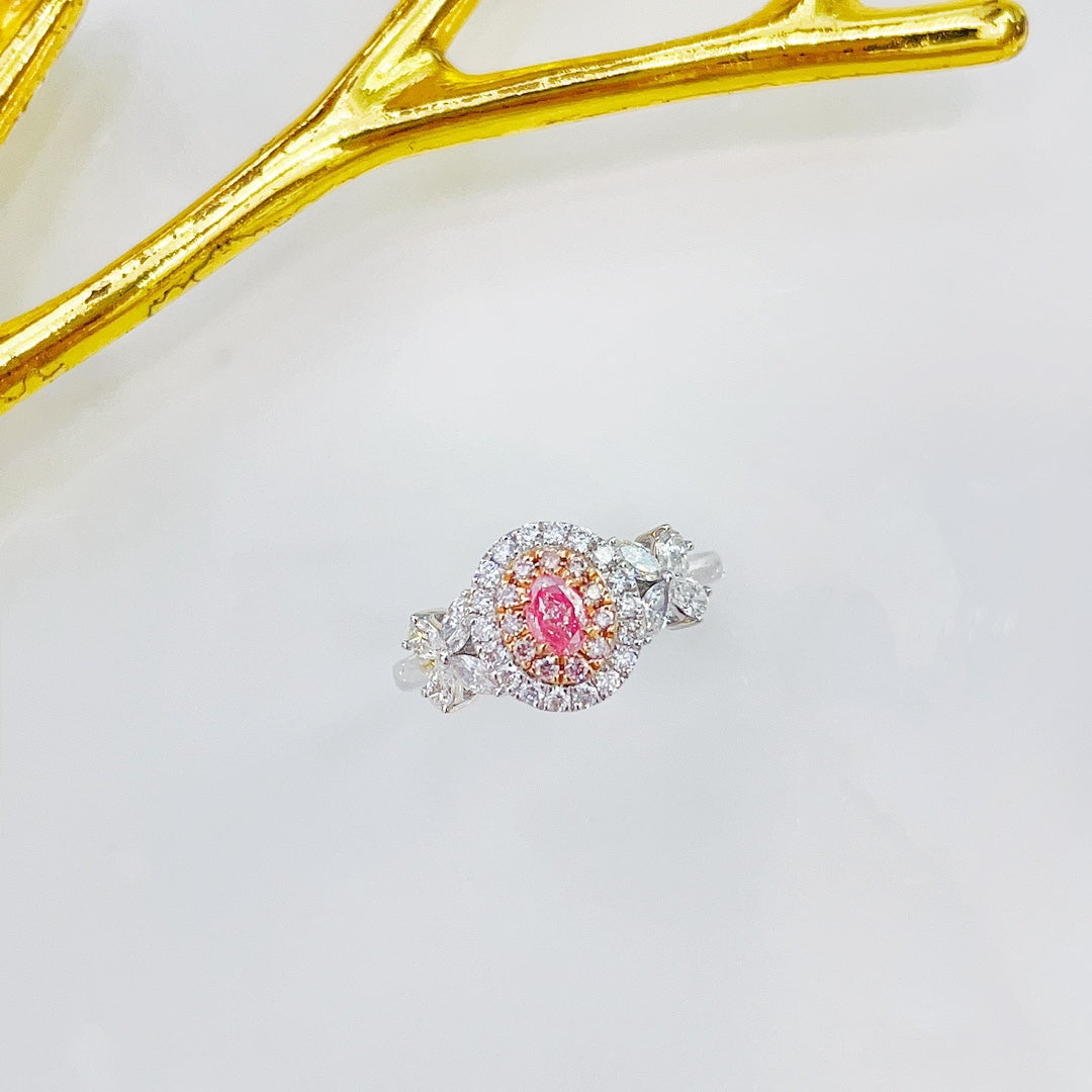 Discover the exquisite elegance of our 18K Pink Diamond Oval Shape Unique Ring, a true masterpiece in jewelry craftsmanship. This ring features a central pink diamond weighing 0.17ct, complemented by accent diamonds totaling 0.62ct, all gracefully set in a luxurious 18K gold setting. With a total weight of 3.09g, this ring is not only a symbol of refined taste but also a statement of unparalleled sophistication.