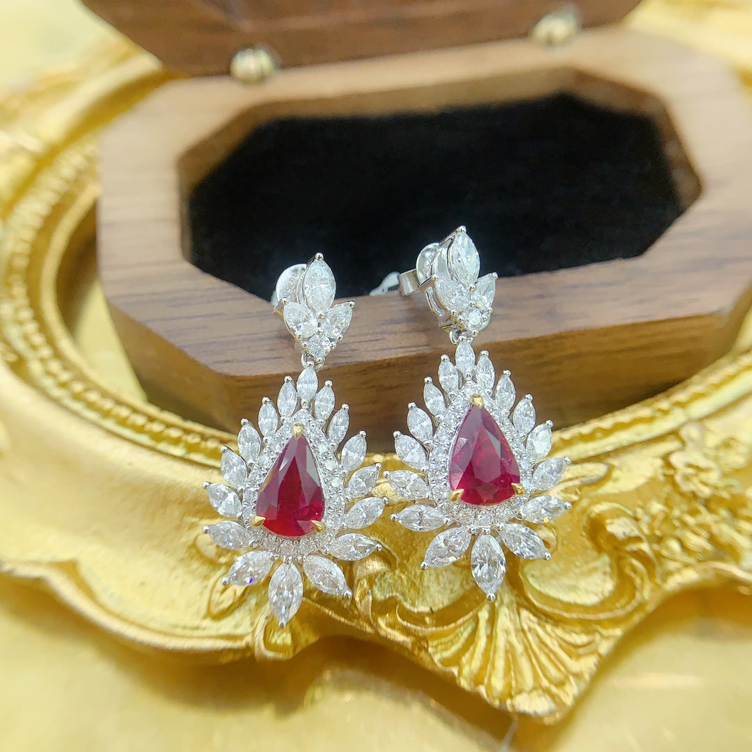 Discover the exquisite elegance of our 18K Red Gemstone Teardrop Surrounding Marquise Earrings, a masterpiece in jewelry craftsmanship. The earrings feature a central gemstone weighing 2.05 carats, complemented by surrounding stones totaling 2.24 carats, all crafted in luxurious 18K gold. With a total weight of 5.04 grams, these earrings are not just a piece of jewelry but a statement of sophistication and refined taste.