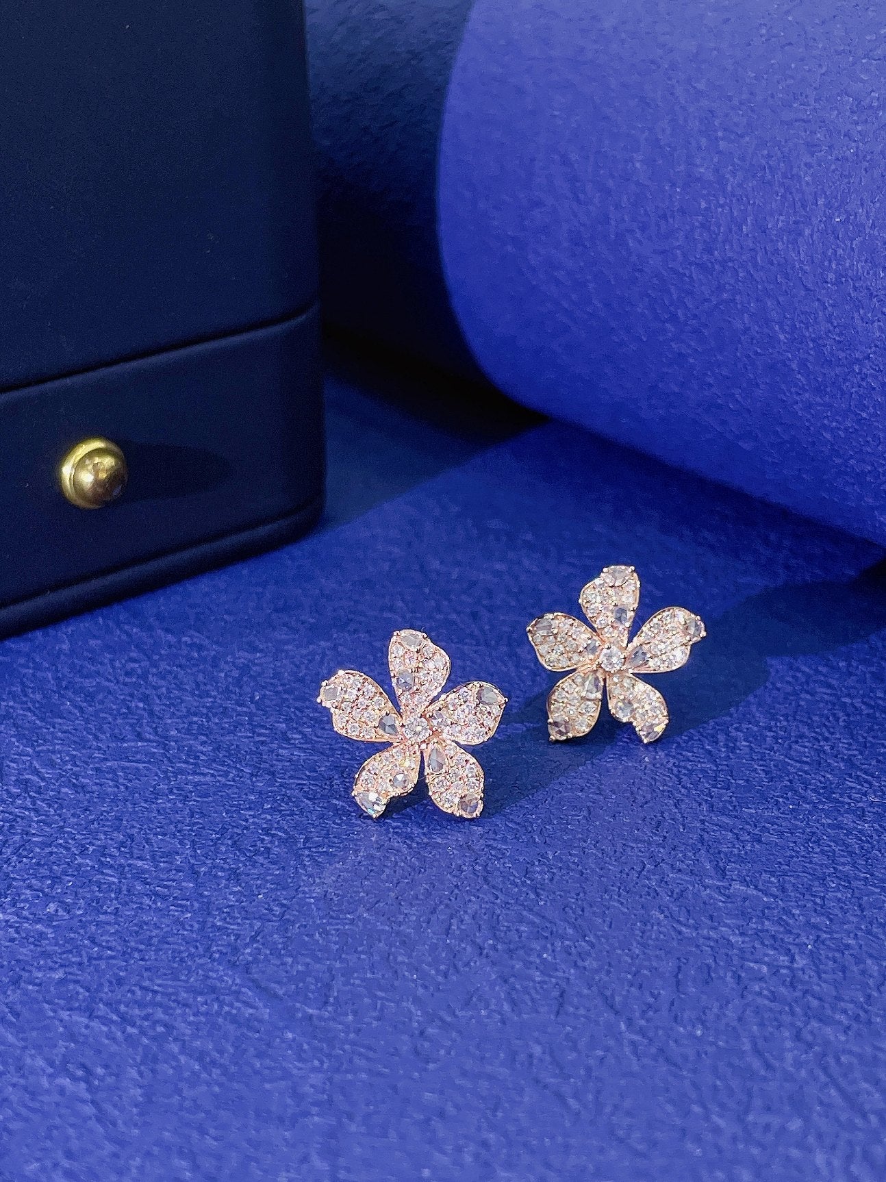 Indulge in the elegance of these exquisite 18K rose gold earrings, featuring a unique five-petal design adorned with a dazzling main diamond of 0.14ct and accentuated by smaller diamonds totaling 0.48ct. The earrings boast a total weight of 2.88g, making them a perfect blend of luxury and comfort. Crafted to perfection, these earrings are a must-have addition to your jewelry collection, exuding timeless beauty and sophistication. Elevate your every look with these stunning pieces of jewelry.