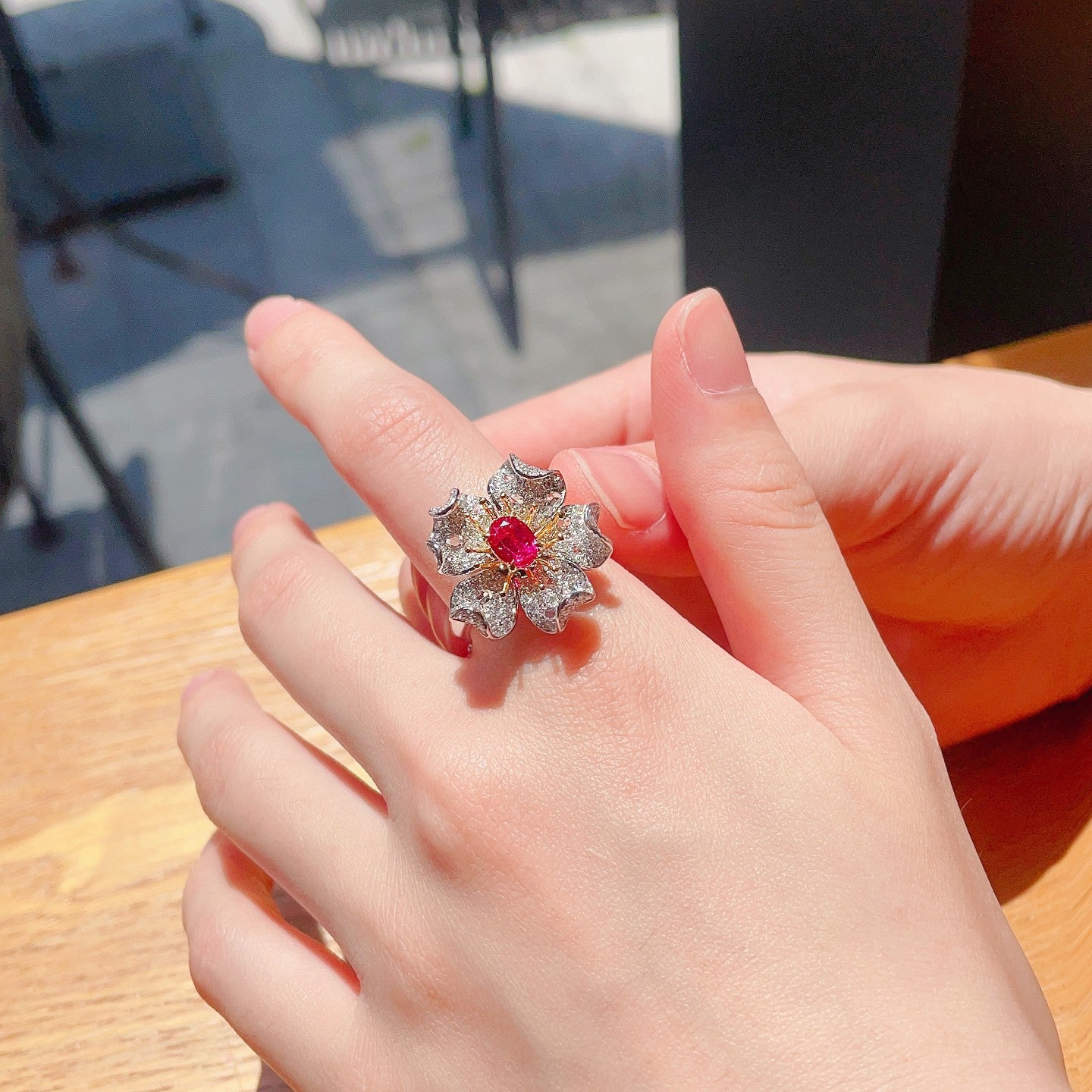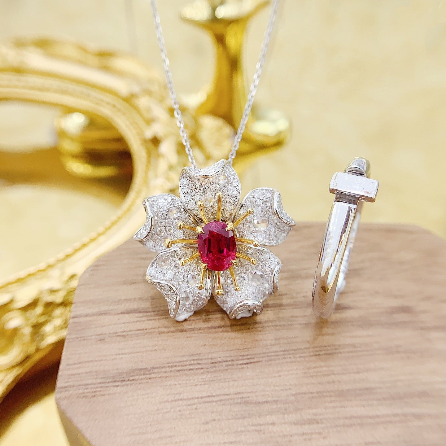 Discover the exquisite elegance of our 18K Ruby Five-Petal Flower Double-Wear Jewelry, a masterpiece crafted to perfection. Adorned with a primary stone of 1.05ct and secondary stones totaling 1.10ct, this jewelry piece weighs 10.2g and features a size 15# ring (adjustable for a personalized fit). Accompanied by an AIGS certificate for the裸 stone, assuring its authenticity as a non-heated pigeon blood red gem. Experience the luxury of this exquisite jewelry that combines beauty, quality, and versatility. Elevate your collection or make a statement gift. Explore the allure of this exceptional piece and indulge in the sophistication it offers. Act now to embrace the elegance of this remarkable jewelry.