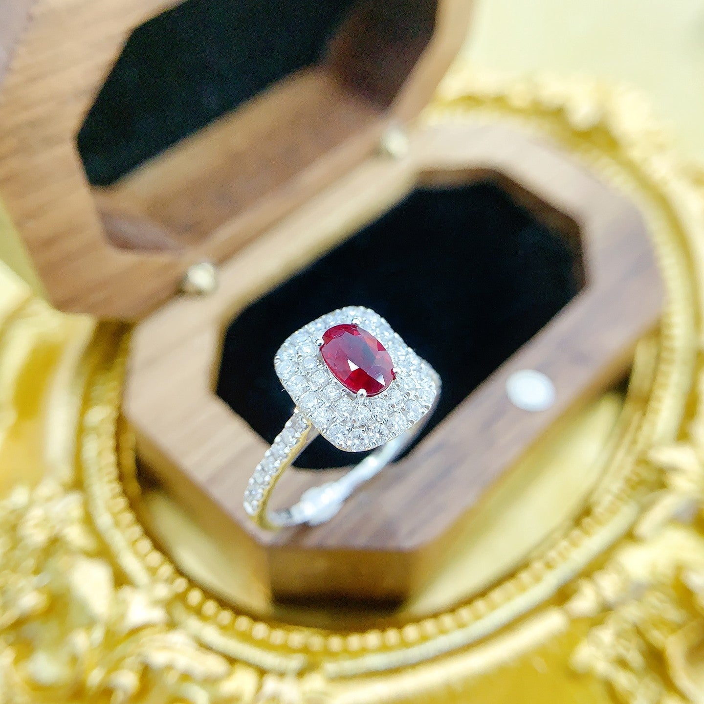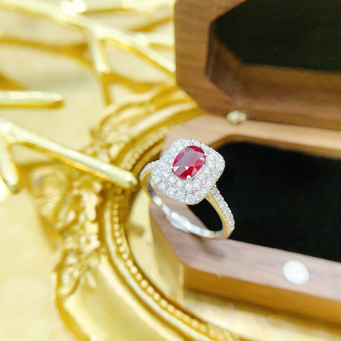 Discover the elegance of our 18K Ruby Oval Double Layer Halo Ring, a true masterpiece in jewelry craftsmanship. This exquisite ring features a central ruby gemstone weighing R0.56ct, complemented by surrounding diamonds totaling d0.53ct, all nestled in a luxurious 18K gold setting. With a total weight of 2.42g, this ring is not just a piece of jewelry but a statement of timeless beauty and sophistication.