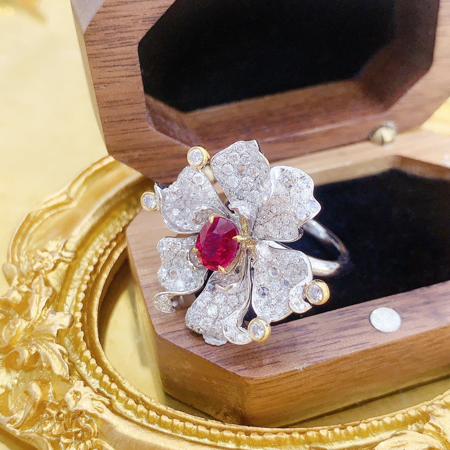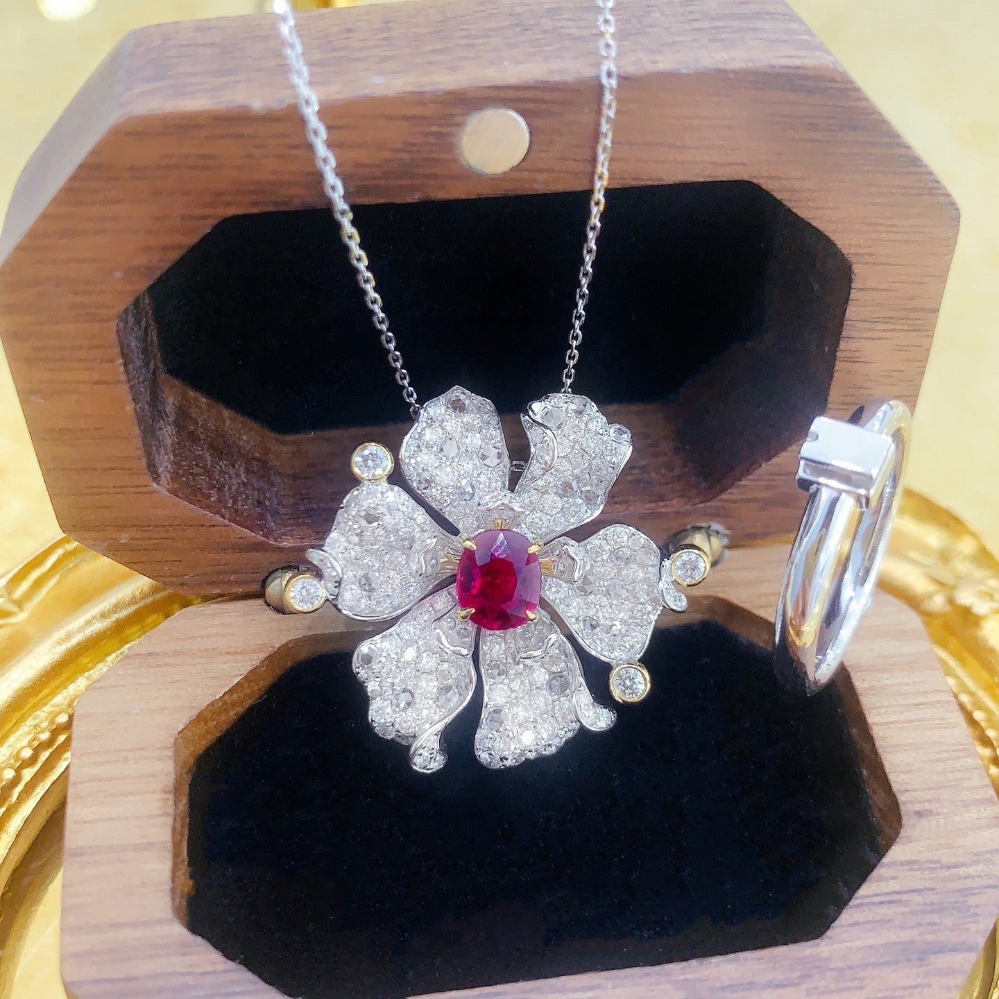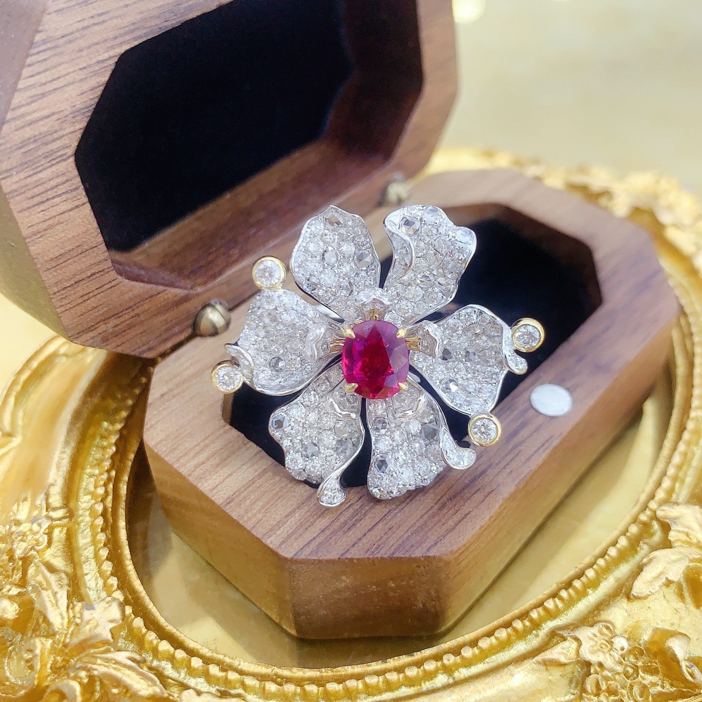 Discover the exquisite elegance of our 18K Ruby Six-Petal Flower Dual-Wear Jewelry, a masterpiece crafted with precision and passion. The centerpiece boasts a remarkable R1.06ct ruby, complemented by d2.65ct of dazzling accent stones, all nestled in a 10.66g design. The adjustable ring size of 13# (customizable) ensures a perfect fit for every unique finger. Accompanied by an AIGS certificate, this jewelrypiece features an untreated pigeon’s blood red ruby, a testament to its authenticity and rarity. Embrace the luxury and make it yours – a statement of timeless beauty that deserves a spot in your precious collection. Experience the allure of fine jewelry that not only enhances your elegance but also makes a compelling investment. Shop now and elevate your style quotient with this exquisite piece.