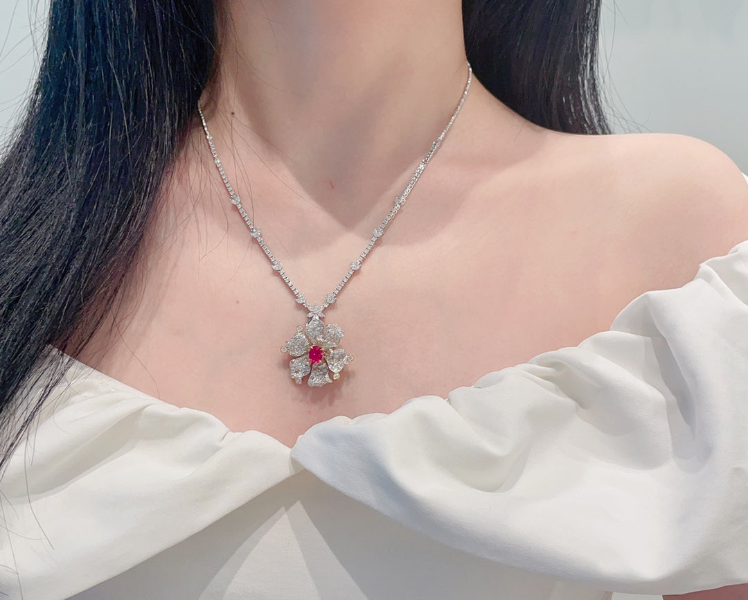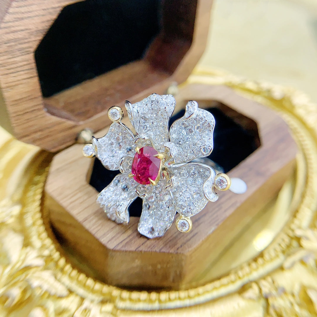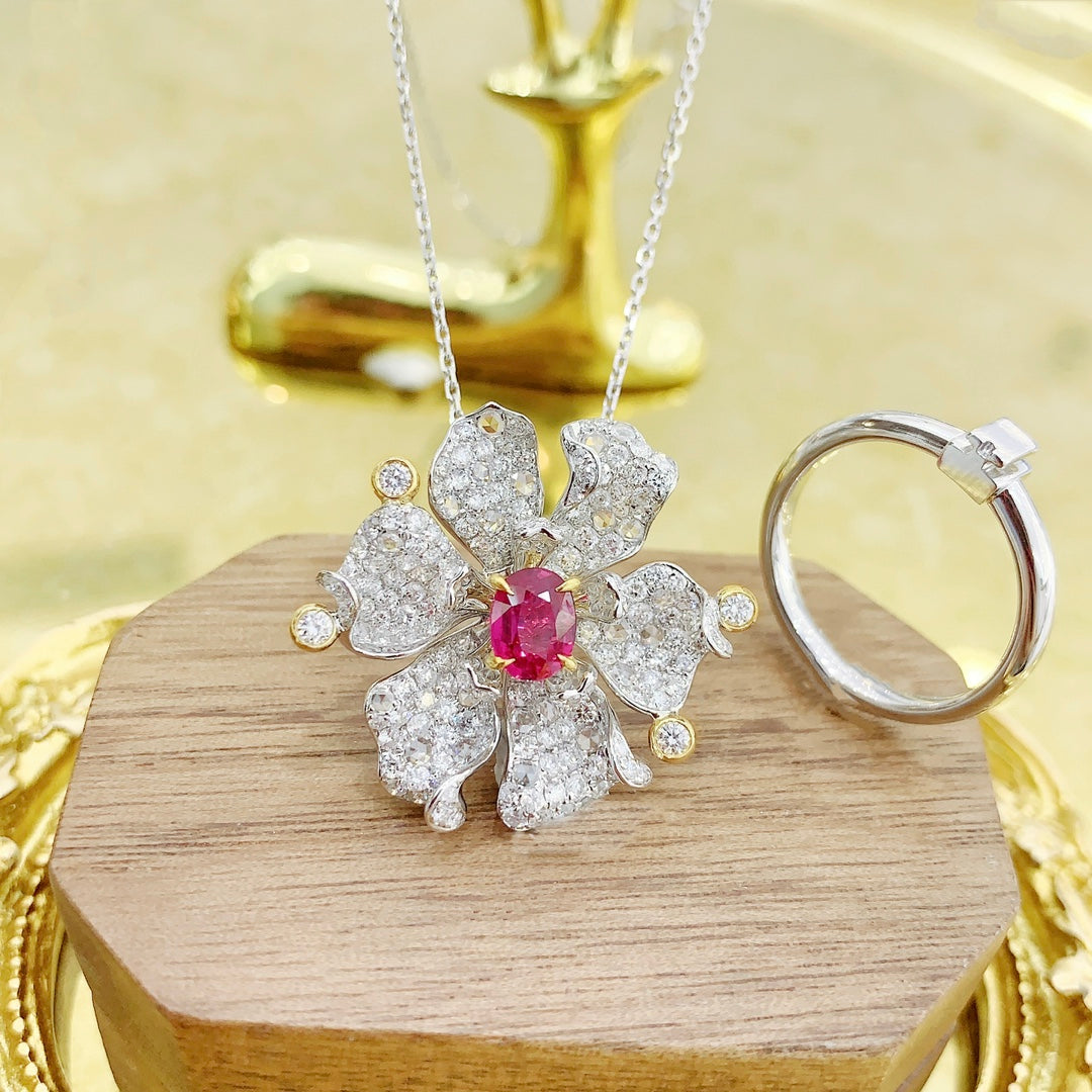 Discover the elegance of our 18K Ruby Six-Petal Flower Transformable Jewelry, a masterpiece crafted with precision and luxury. The centerpiece boasts a magnificent R1.08ct ruby, complemented by dazzling d2.65ct accent stones, all nestled in a 11.05g frame. The ring size is 15# (adjustable for a perfect fit). Accompanied by an AIGS certificate for the unheated pigeon blood red ruby, this jewelry piece is a testament to authenticity and quality. Experience the allure of this exquisite jewelry that transcends trends, inviting you to indulge in a timeless piece that resonates with sophistication and class. Elevate your collection with this rare gem that promises both investment and admiration. Explore the luxury that awaits – make it yours today!