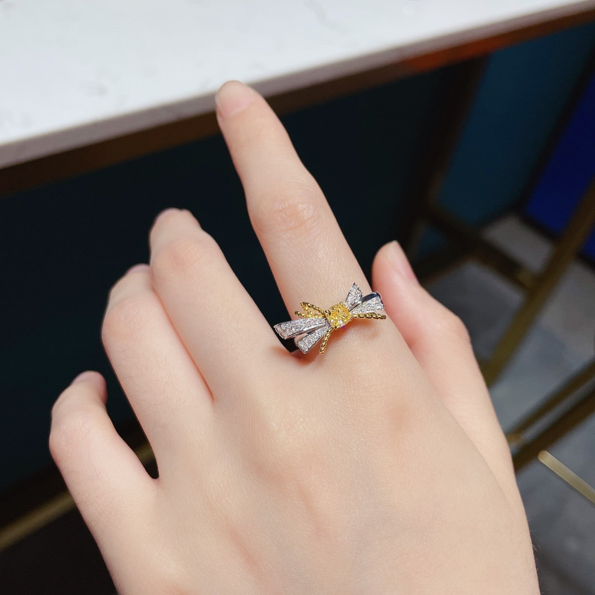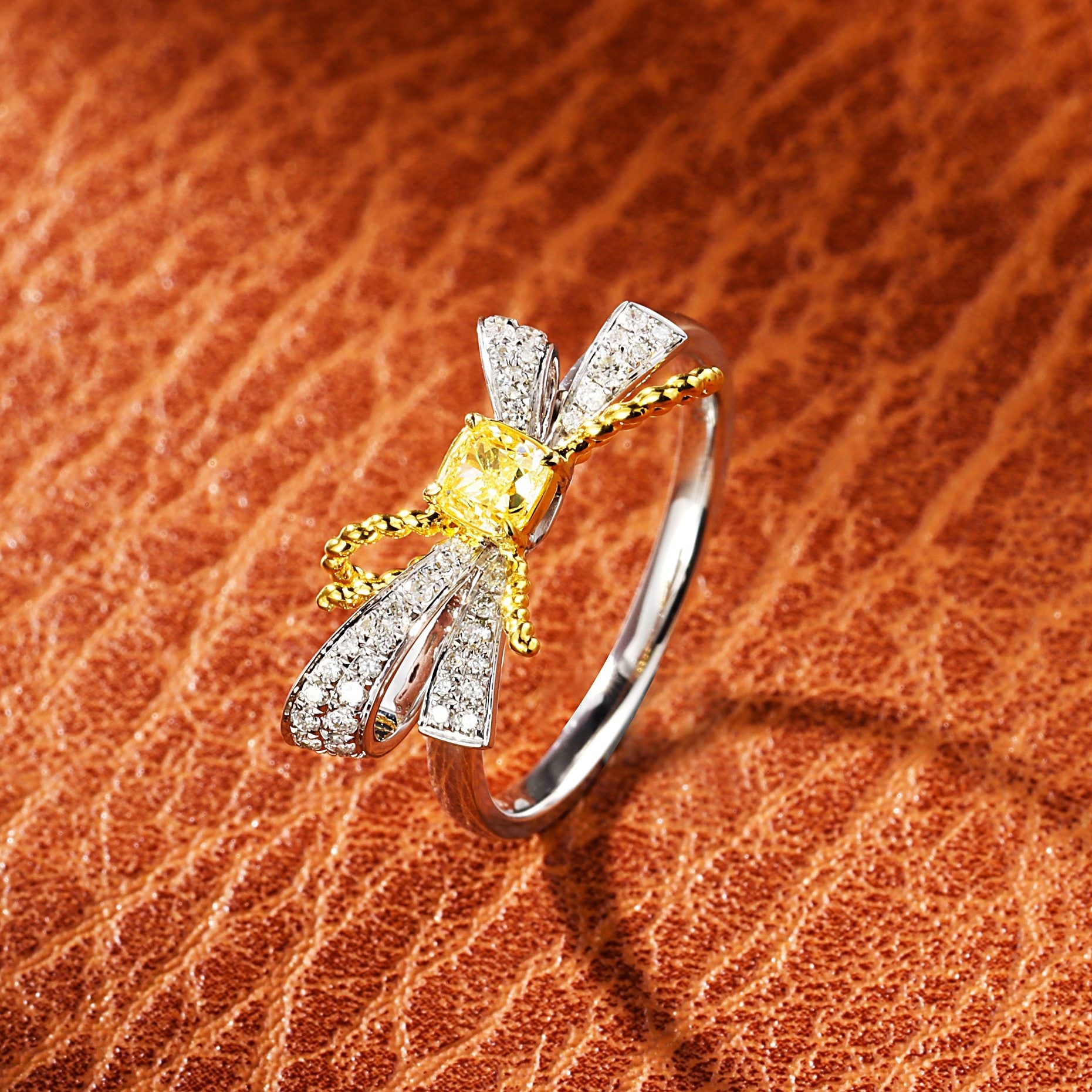 Invest in this piece of jewelry that not only reflects your personal style but also stands as a symbol of timeless beauty and elegance. Embrace the luxury and make this 18K yellow gold diamond cushion-shaped bowknot ring a cherished part of your jewelry collection. Elevate your style quotient today – seize the opportunity to own this exquisite masterpiece.