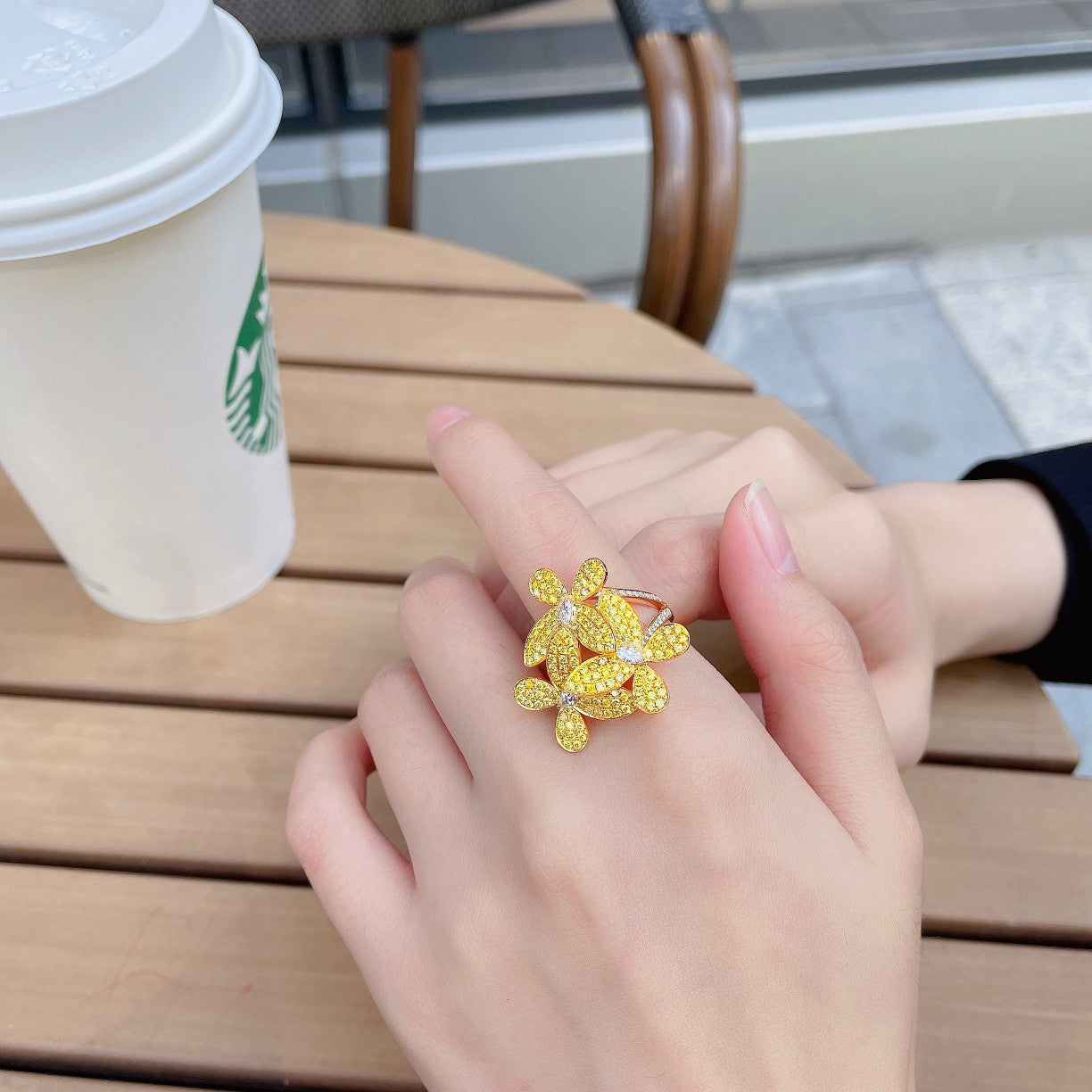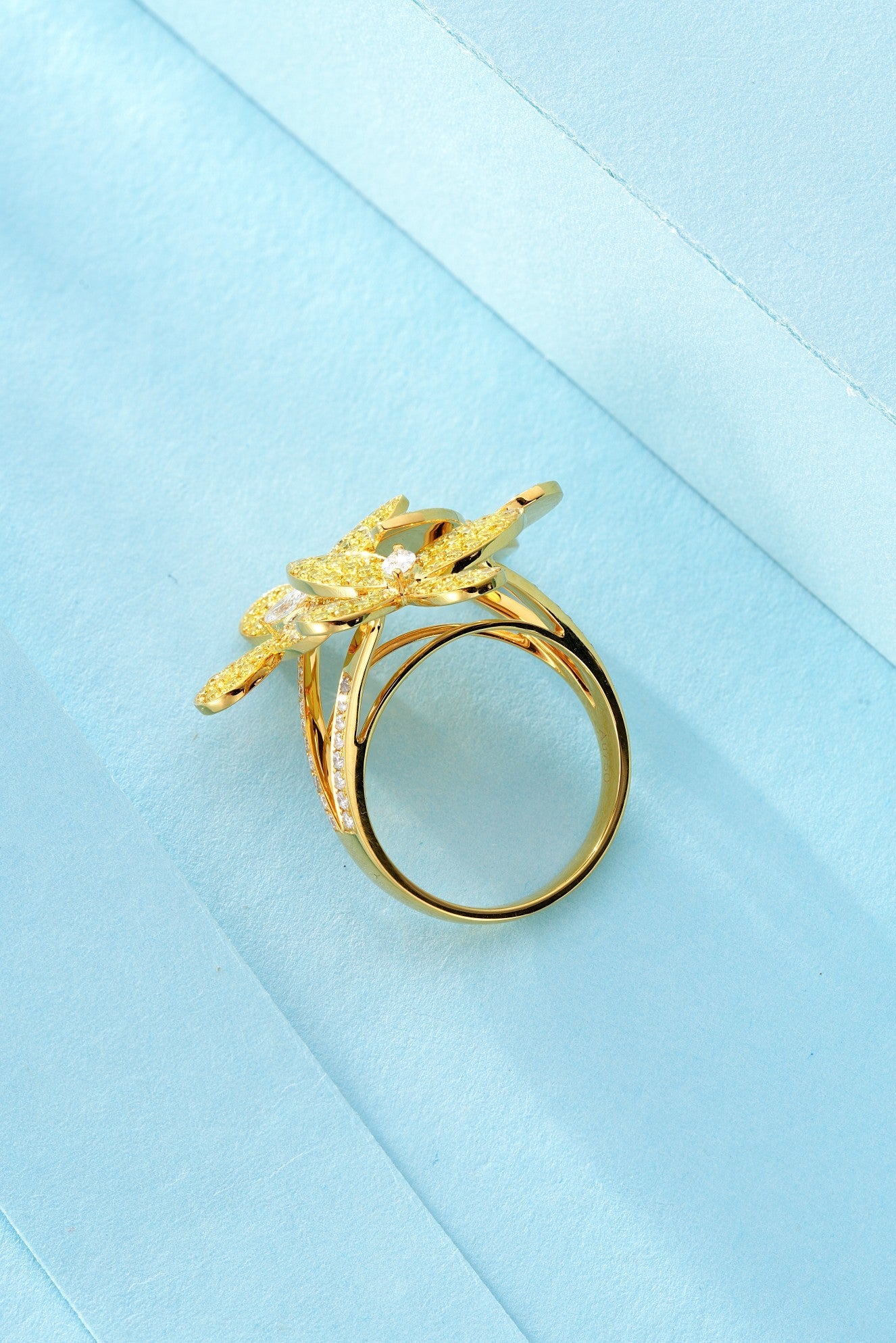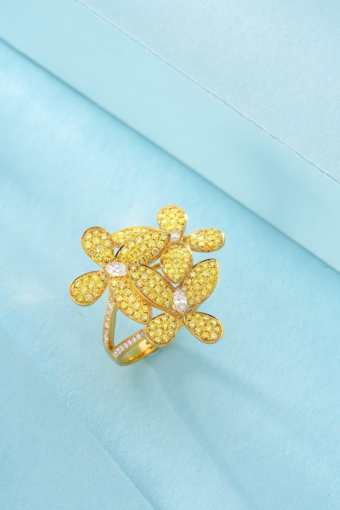 Discover the exquisite beauty of our 18K yellow gold diamond three-flower ring, a stunning piece of jewelry that combines elegance with luxury. The main stone boasts a D1.26ct diamond, complemented by a d0.43ct diamond as the accent stone, all set in a 7.53g masterpiece. Crafted to perfection, this ring is available in sizes 12 to 14#, with the option for resizing to ensure a perfect fit.