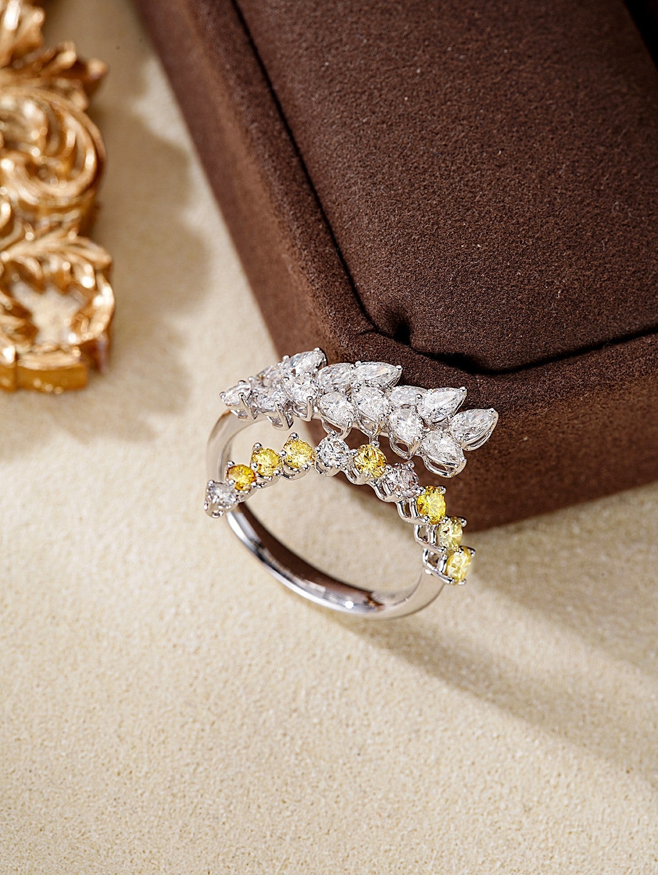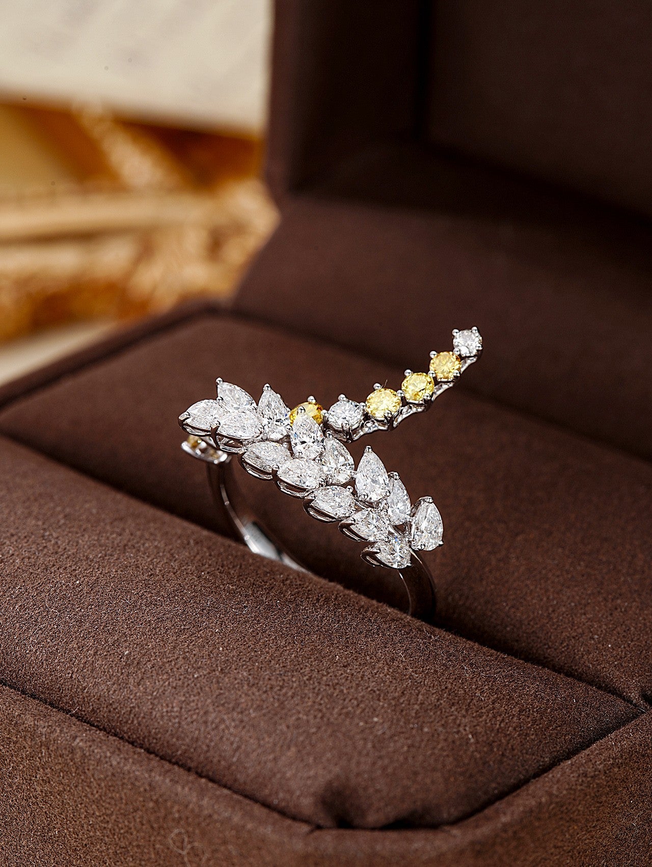 Introducing our exquisite Diamond Wheat and Water Drop Ring, a unique jewelry masterpiece crafted to perfection. This ring features a stunning main diamond weighing 1.079 carats, complemented by an elegant accent diamond of 0.701 carats, all nestled in a setting that totals 4.070 grams. The intricate design combines the beauty of nature-inspired elements with timeless elegance, making it a perfect choice for those who appreciate the finer details in jewelry.
